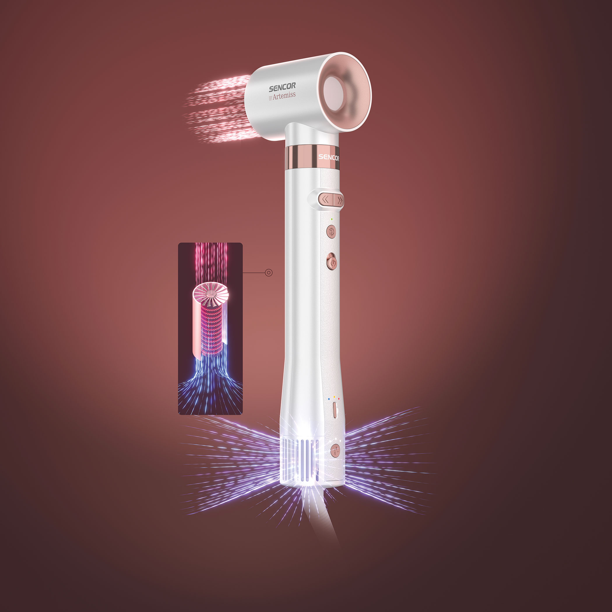 Profesionální výkon a šetrnost k vlasům vám nabízí vysokorychlostní kulmofén Sencor SHS 9200RS Artemiss. Kombinace vysoké rychlosti proudění vzduchu a teploty vysuší, a zároveň upraví vaše vlasy rychleji a tišeji než běžné fény. Jediný přístroj, nekonečné množství stylingů.Coanda efekt pro lokny bez námahy