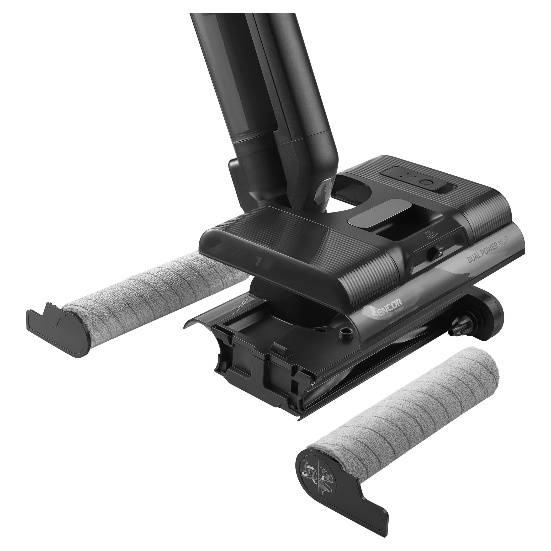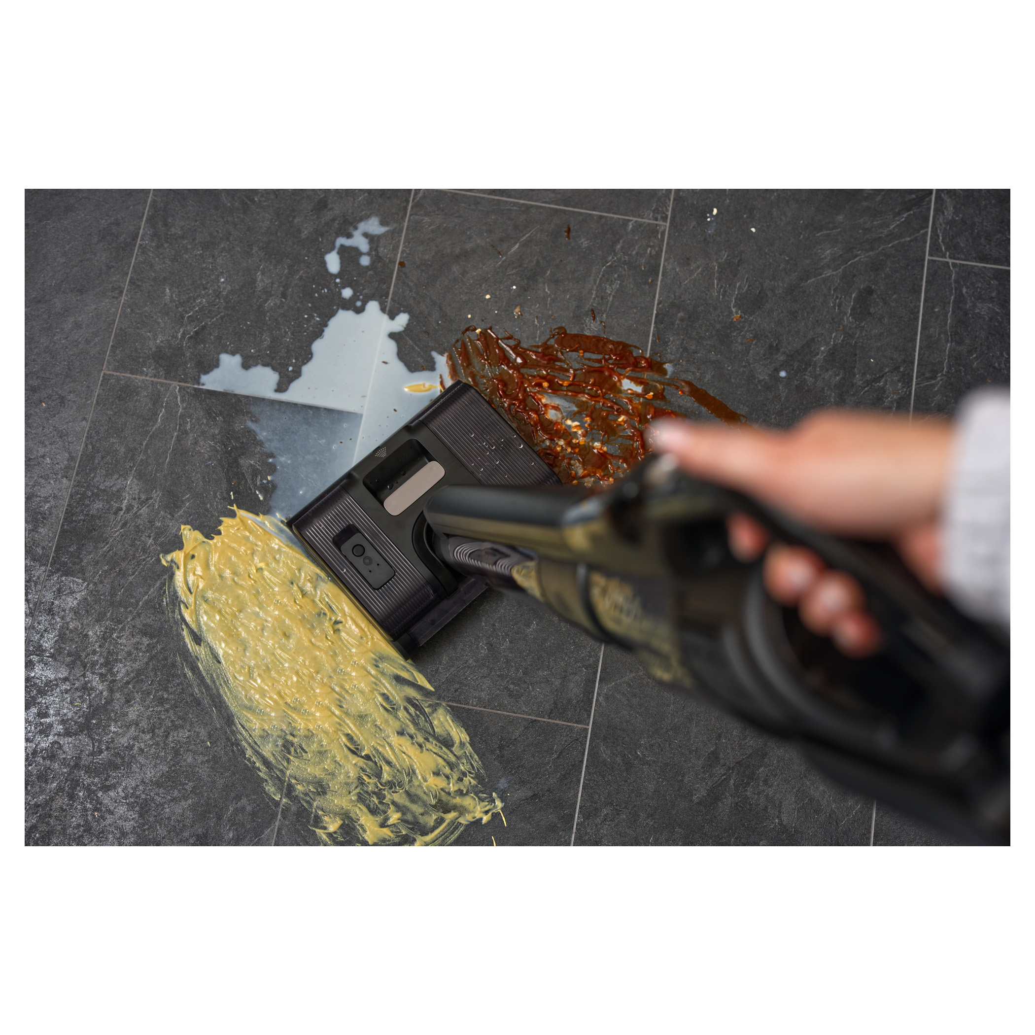 Čistič bez problému vysaje suché i mokré nečistoty. Snadno tak uklidí i vylité pití nebo převrhnuté jídlo. V režimu mokrého čištění vydrží na jedno nabití až 30 minut.Systém dvou rotačních kartáčů