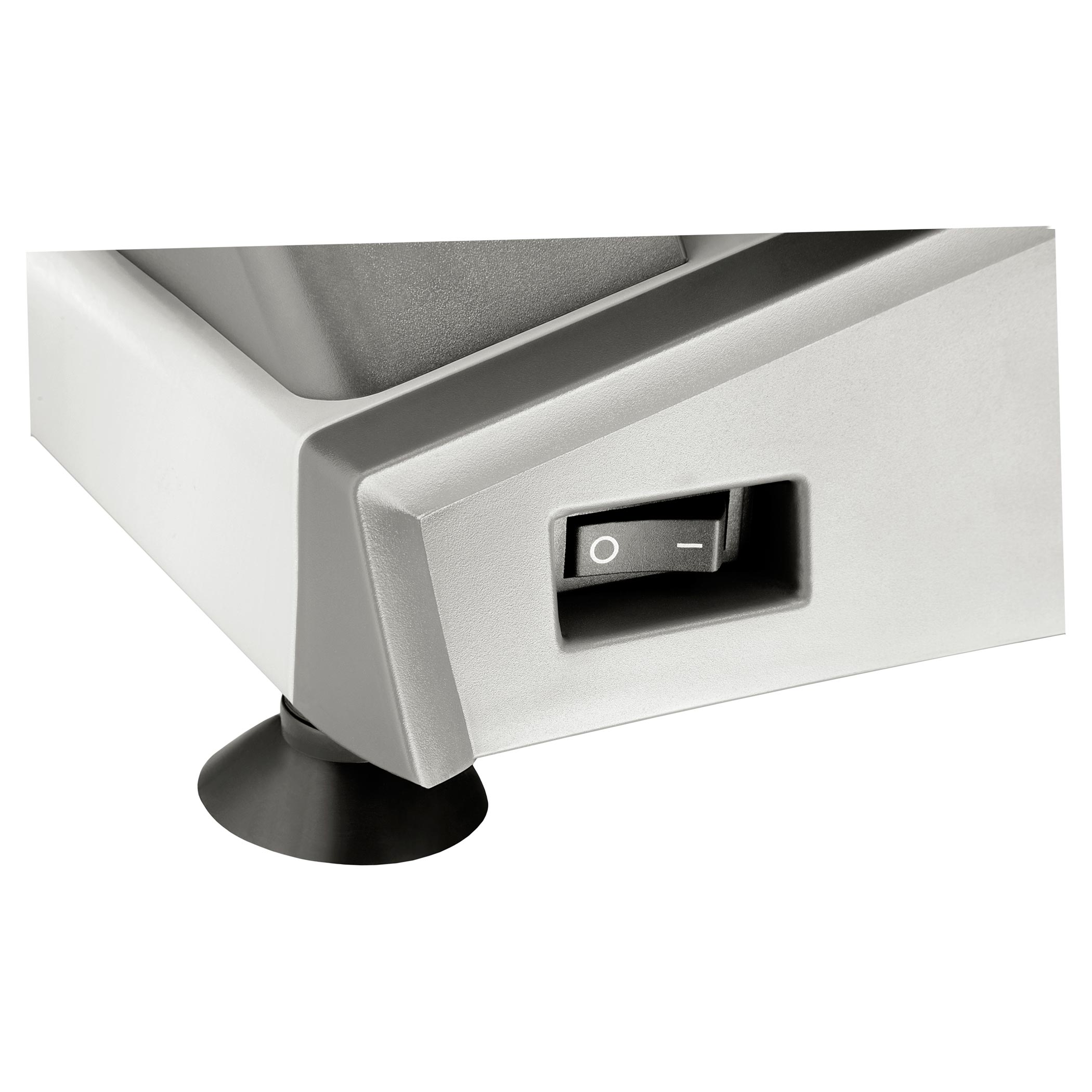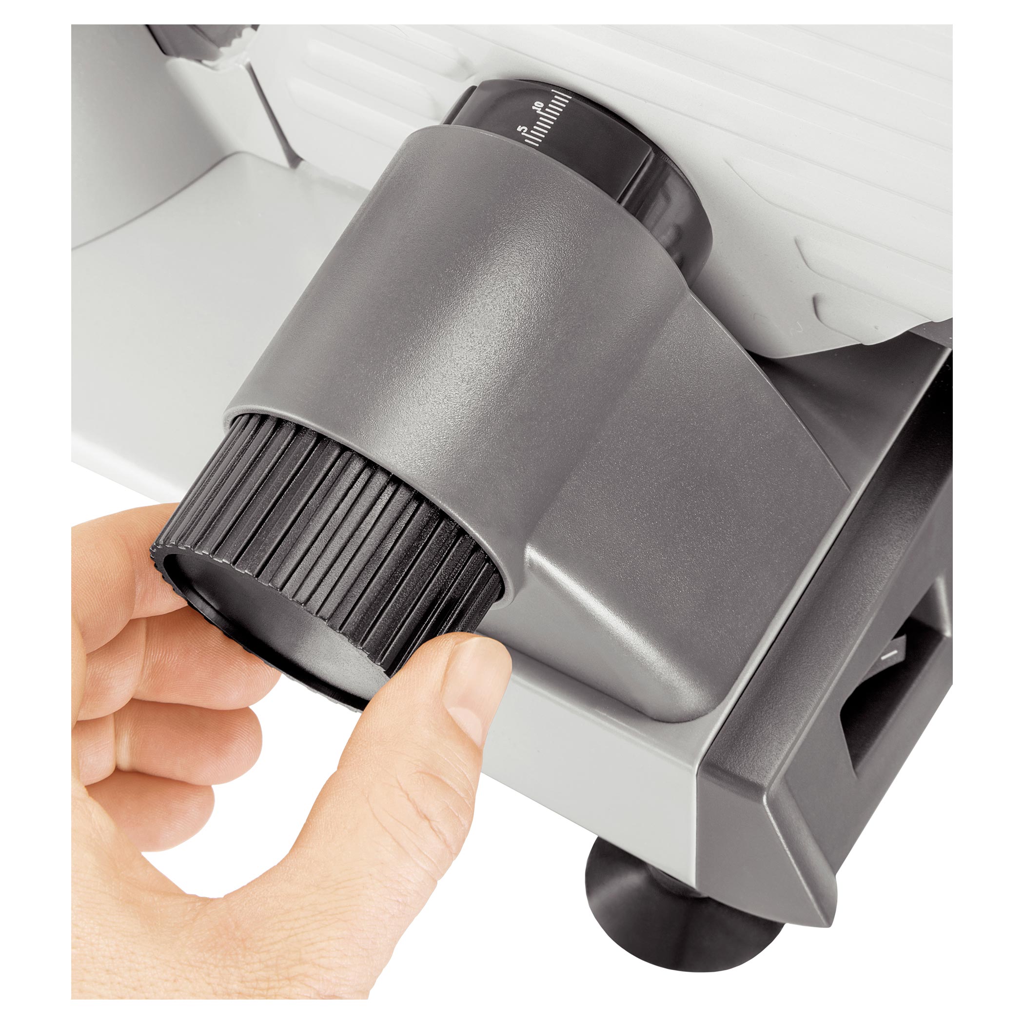 K největším přednostem tohoto kráječe potravin patří šikmý podavač s hladkou posuvnou lištou se zarážkami v obou směrech – použití je tedy snadné a bezpečné.