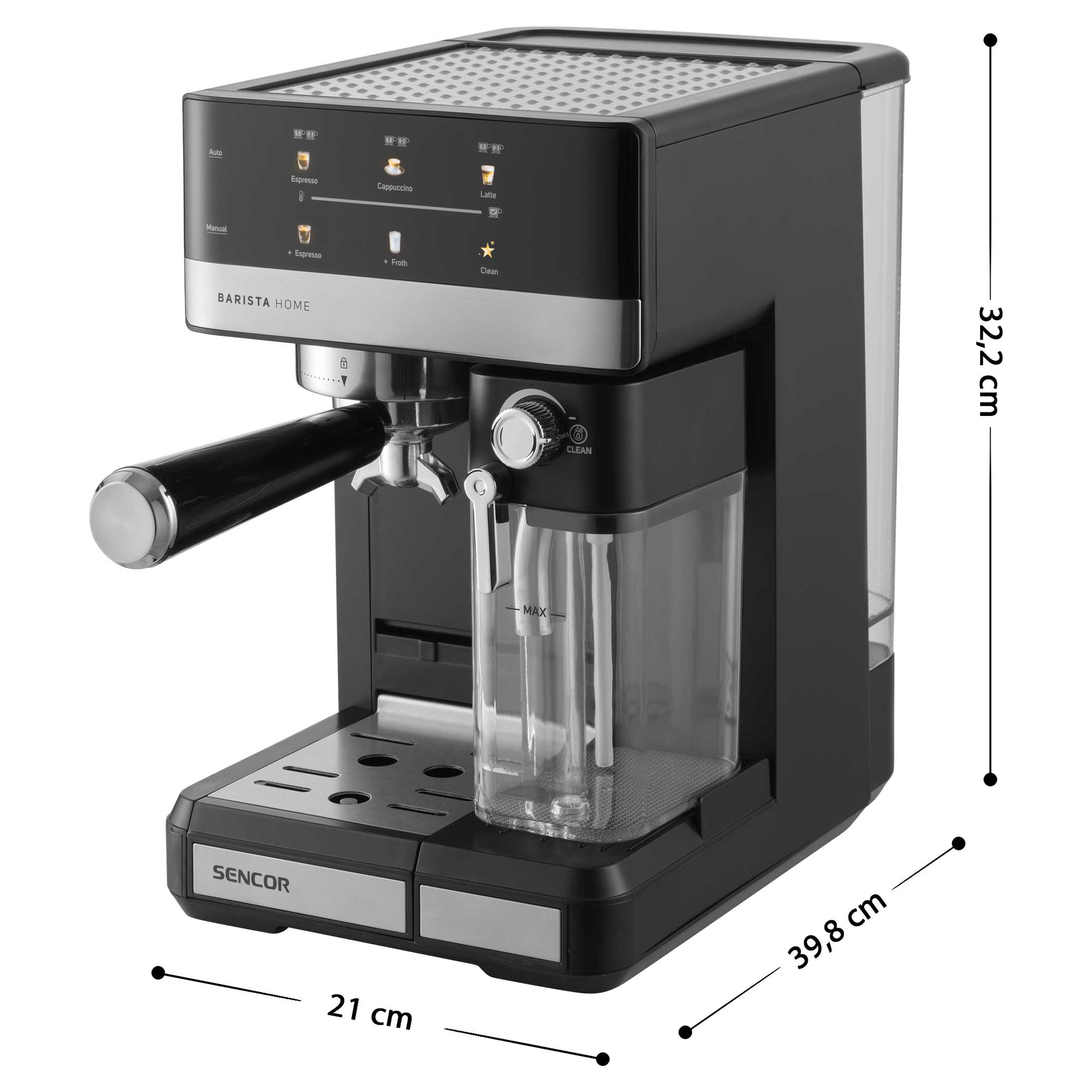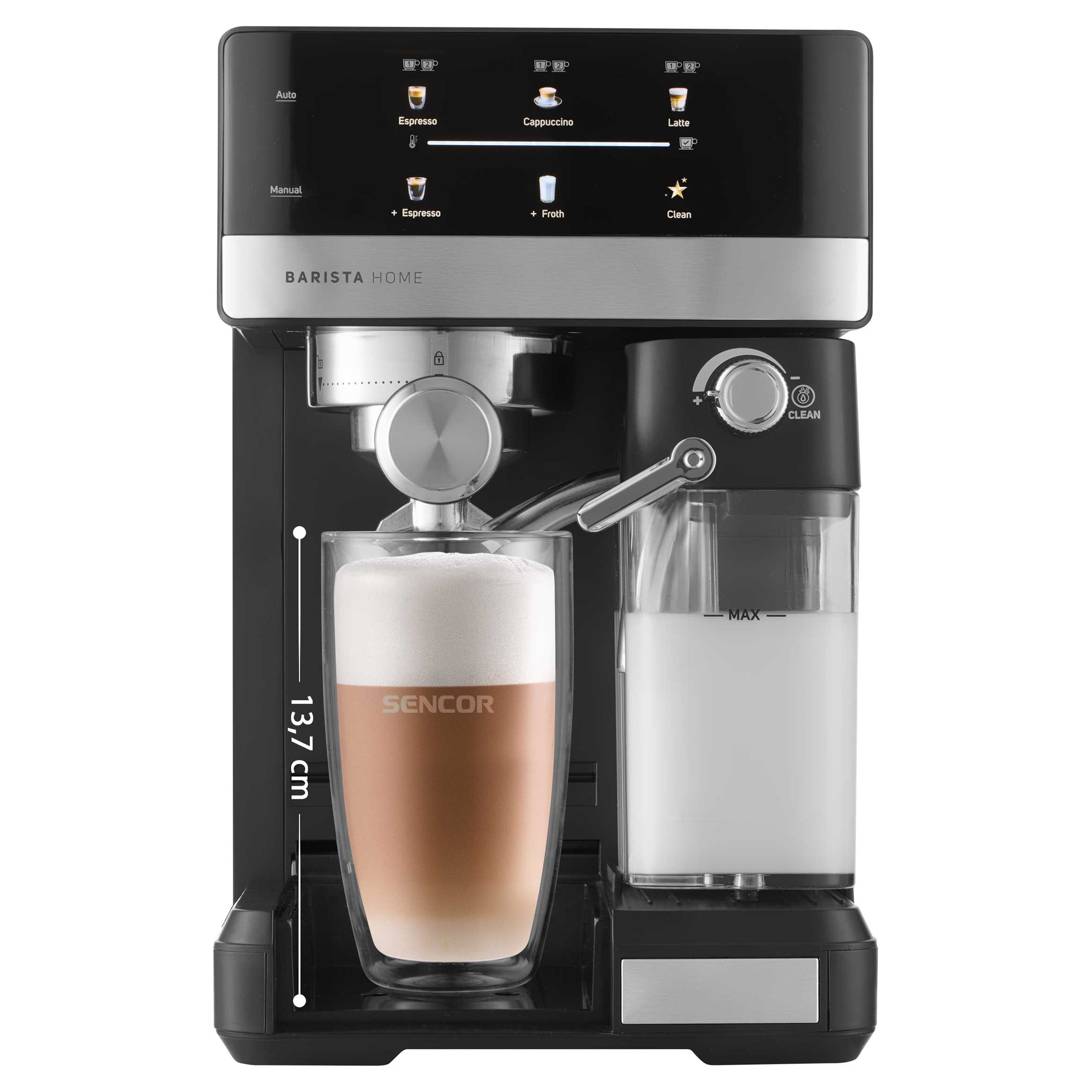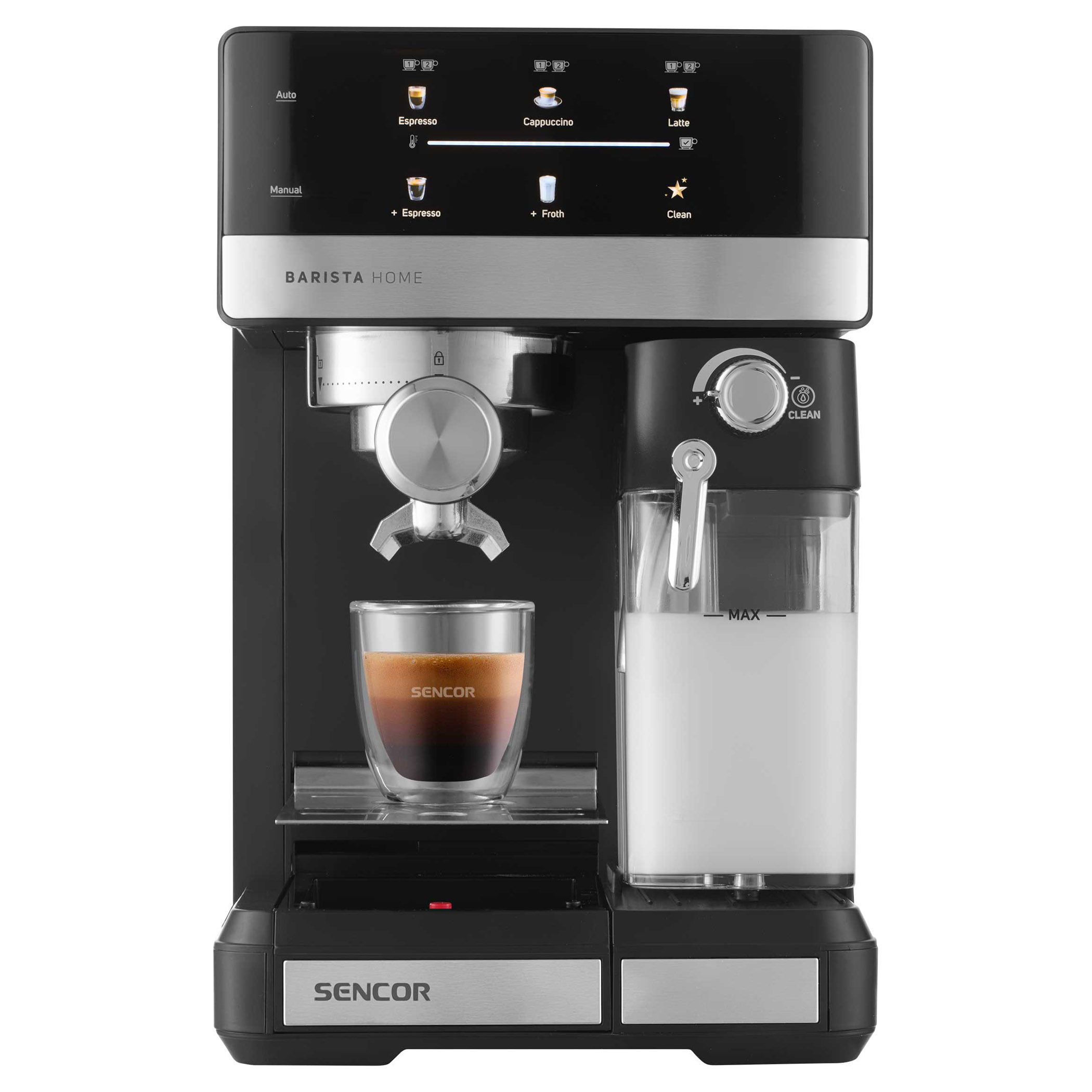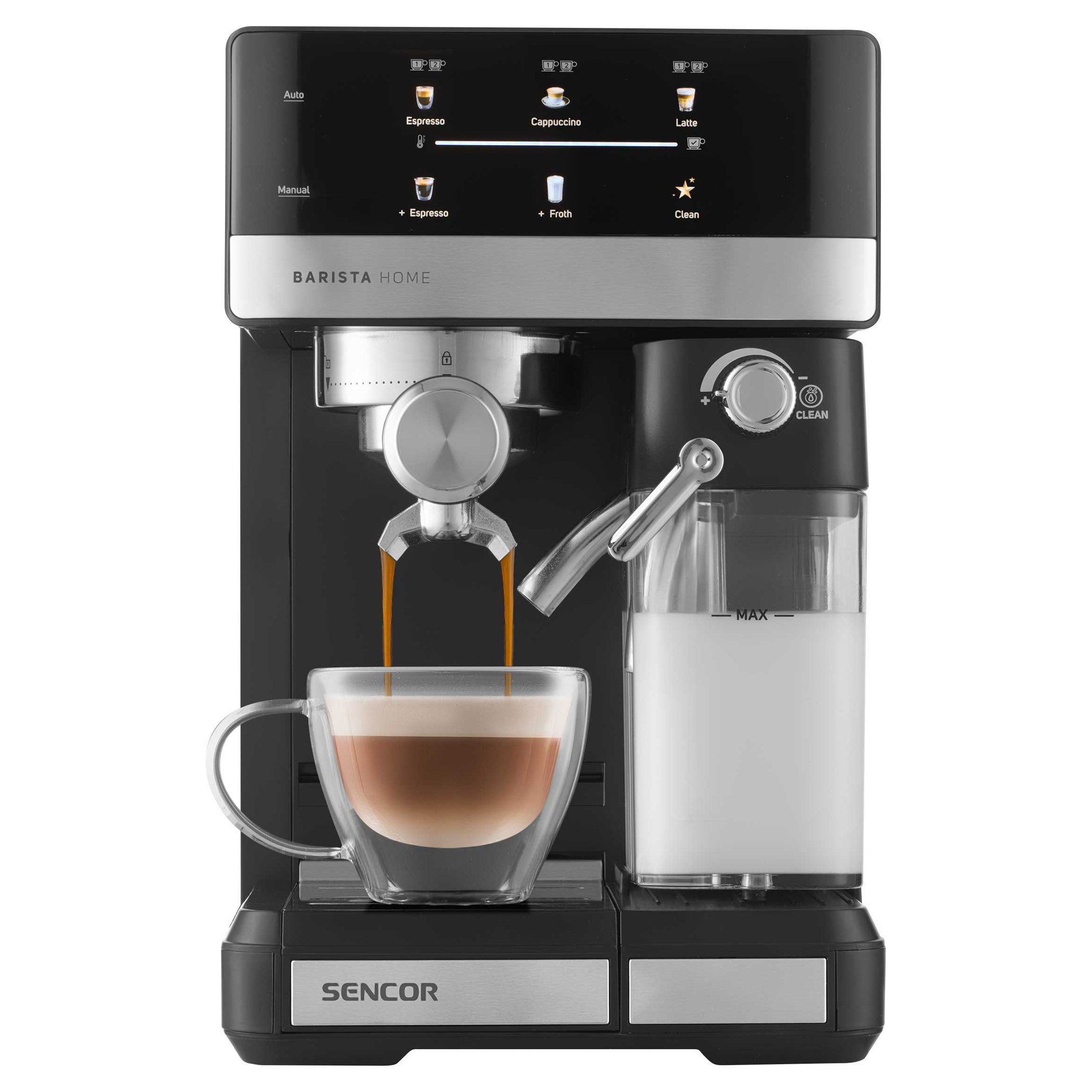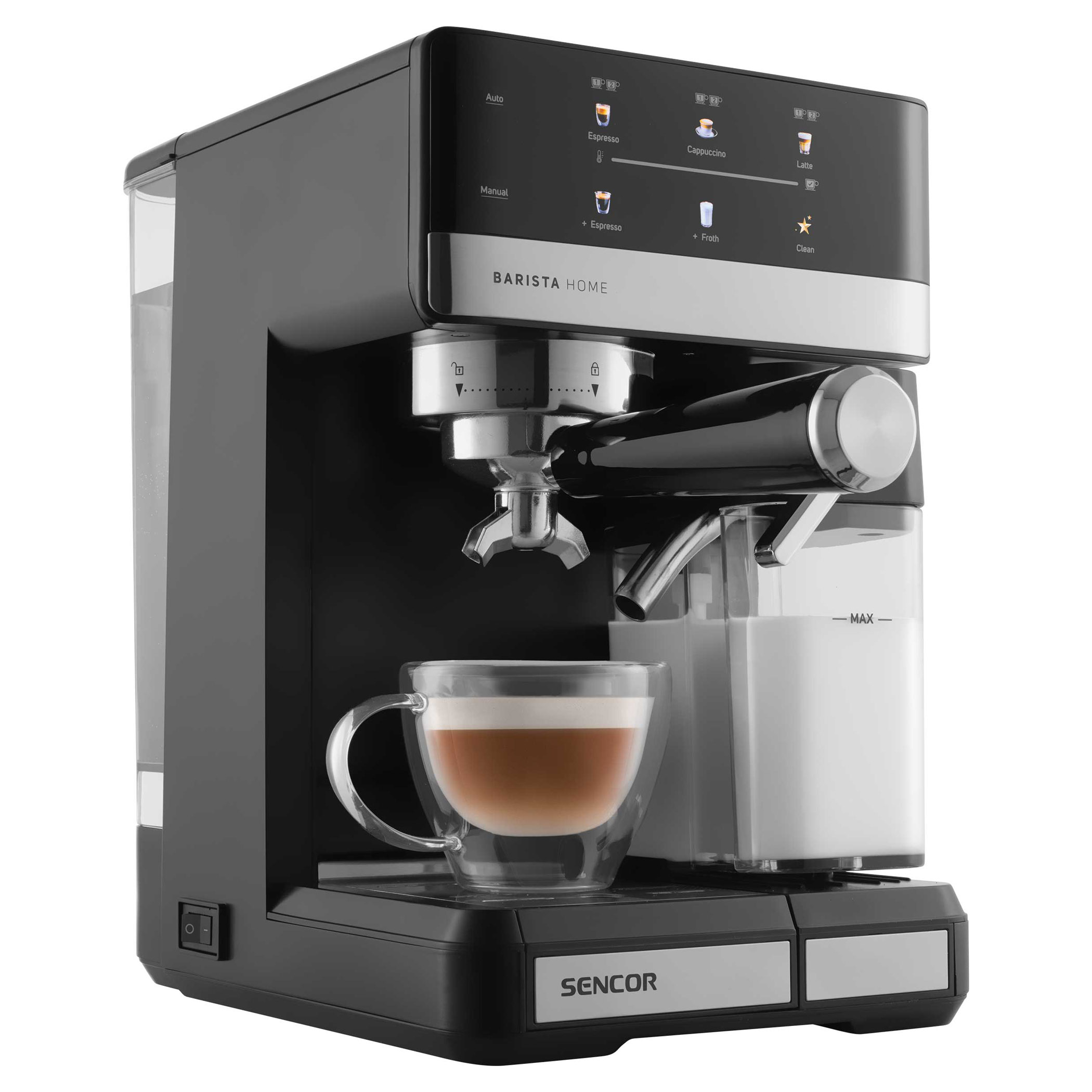 Pákový Espresso kávovar s automatickým napěňováním mléka Sencor SES 4060BK se postará o přípravu chutné kávy s mlékem i bez díky čerpadlu s tlakem 20 barů a automatickým systémem pěnění mléka. Snadná obsluha vašeho domácího baristy je samozřejmostí zásluhou odnímatelné nádržky na mléko a barevného dotykového displeje.