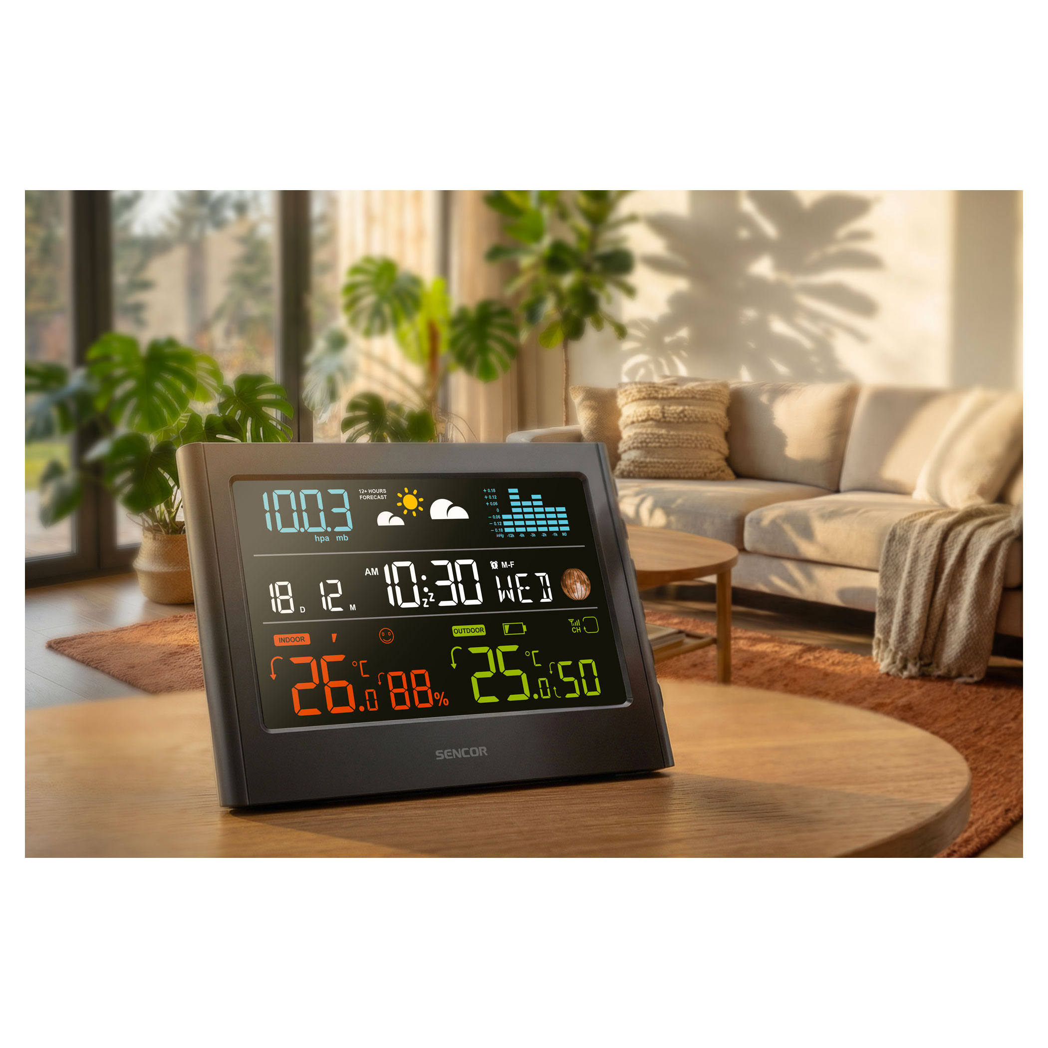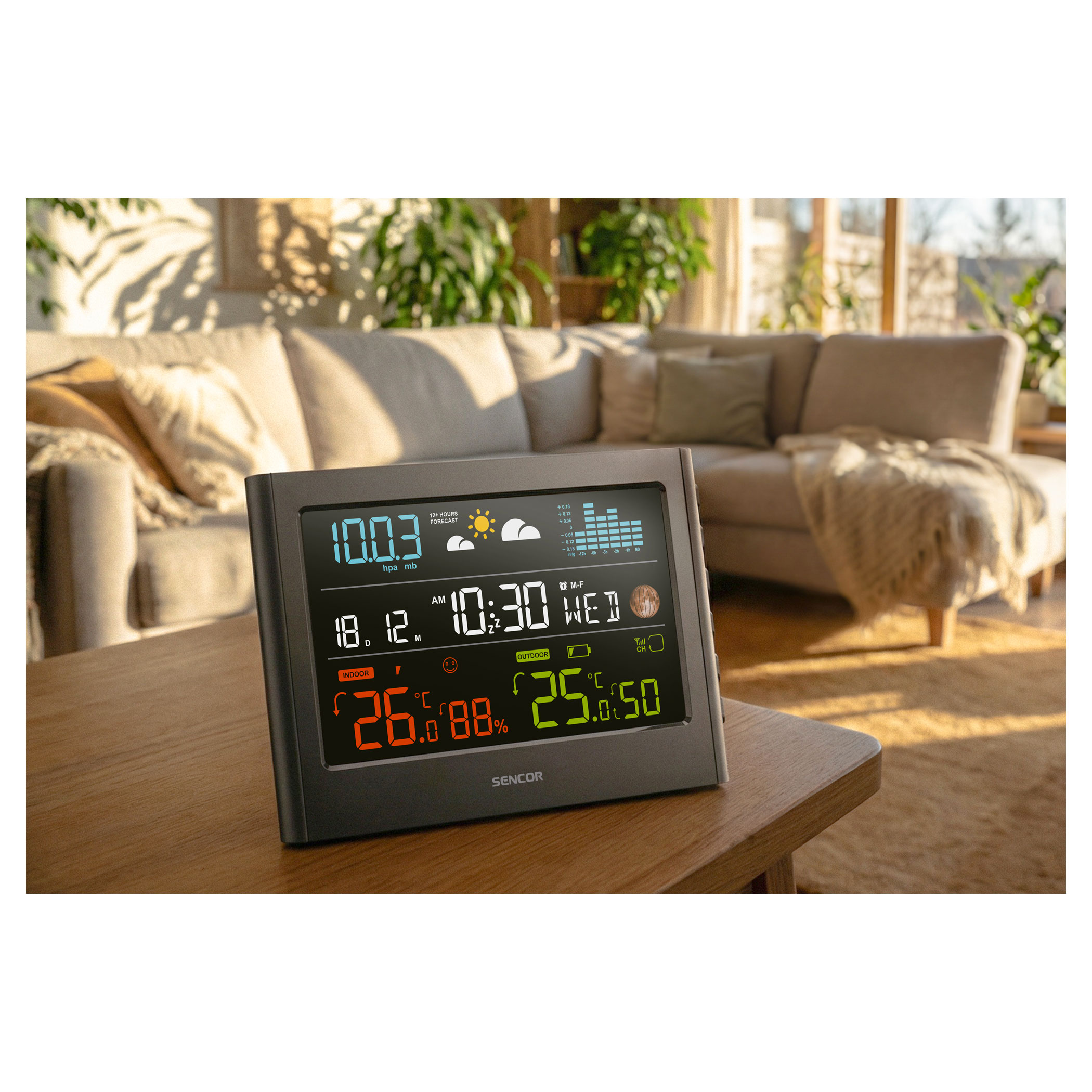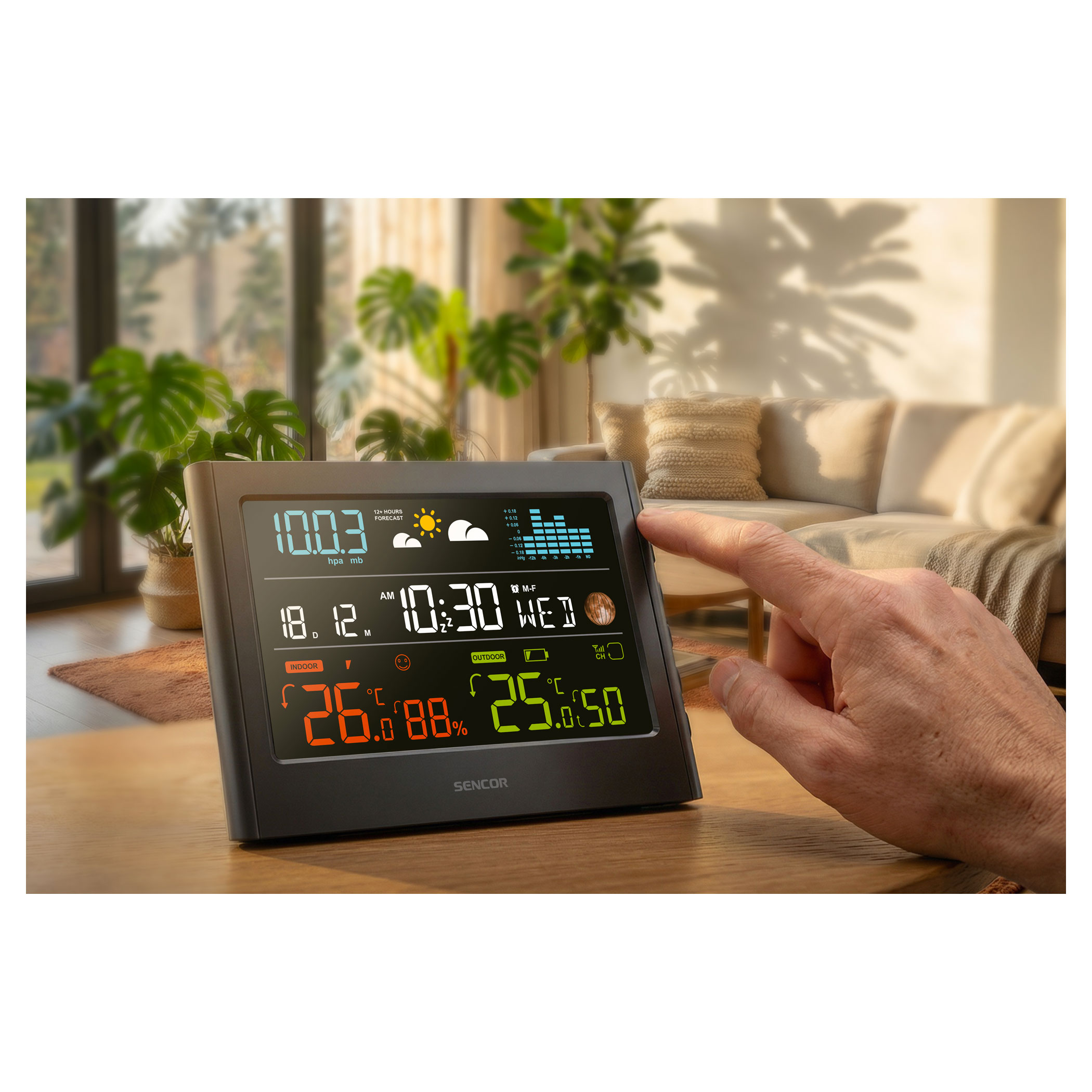 Stanice analyzuje změny barometrického tlaku a teploty a poskytuje předpověď počasí na 12–24 hodin. Přehledné ikony zobrazují slunečno, mírně oblačno, oblačno, déšť a sněžení. Sledujte také vnitřní i venkovní teplotu a vlhkost s indikátorem vývoje.