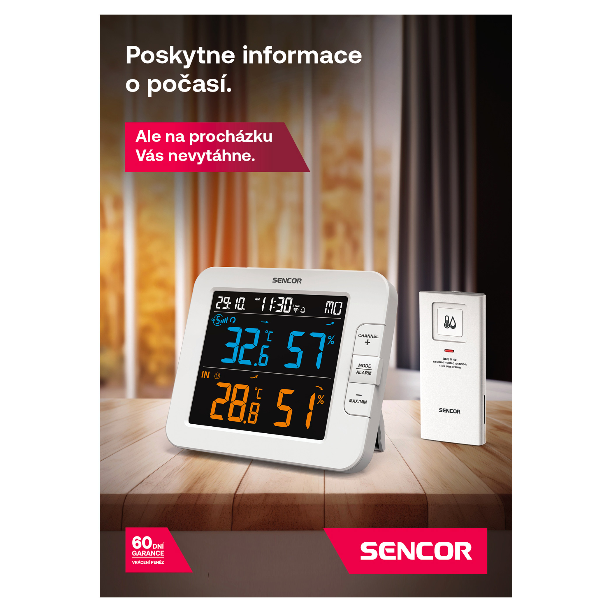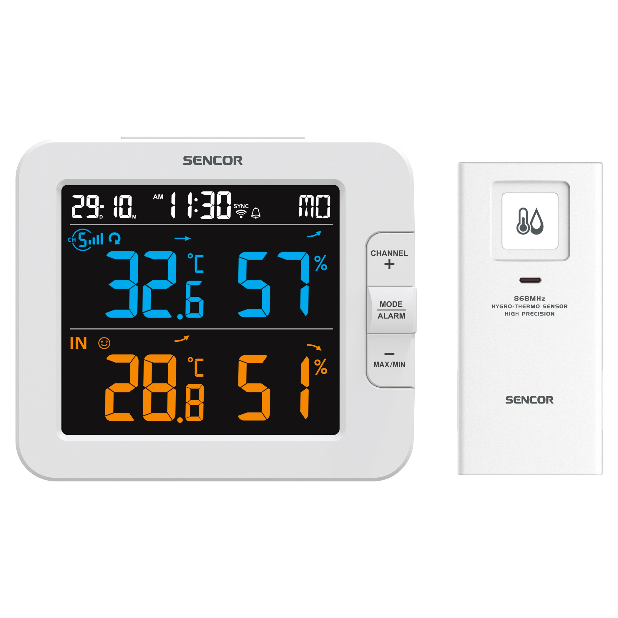 Měřicí stanice zobrazuje digitální hodiny s datem a možností volby mezi formátem času na 24 a 12 hodin. Jsou plně synchronizovány pomocí internetového připojení. Můžete si nastavit budík s opakovaným buzením a umístit stanici na noční stolek pro příjemný start každého dne. Aby byla stanice dobře čitelná, nebo aby večer nerušila, je možné nastavit jas ve 2 a kontrast dokonce v 15 krocích. Kromě přiloženého bezdrátového senzoru je možné do této vícekanálové stanice připojit až 6 dalších senzorů. Chytrá měřicí stanice od značky Sencor je praktickým doplňkem každé domácnosti.