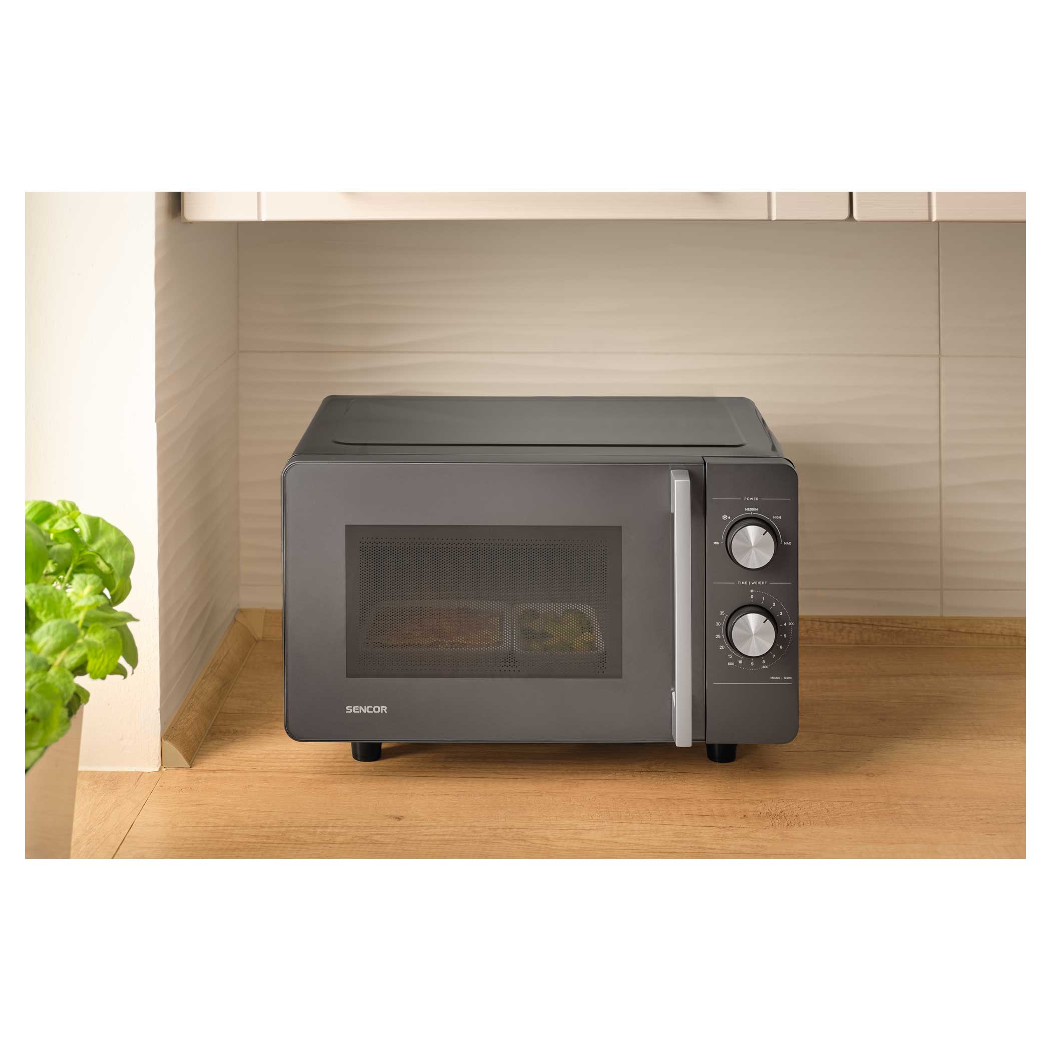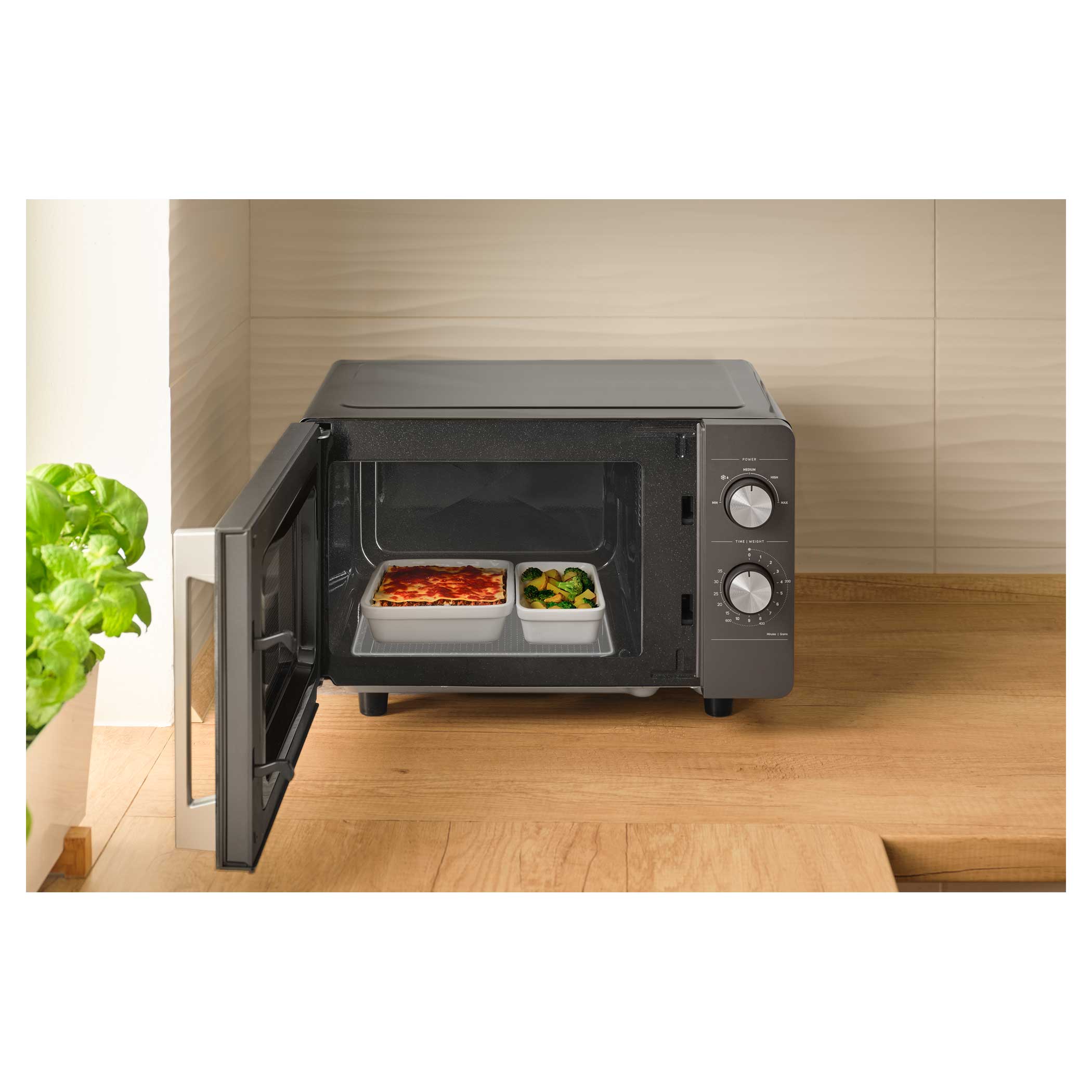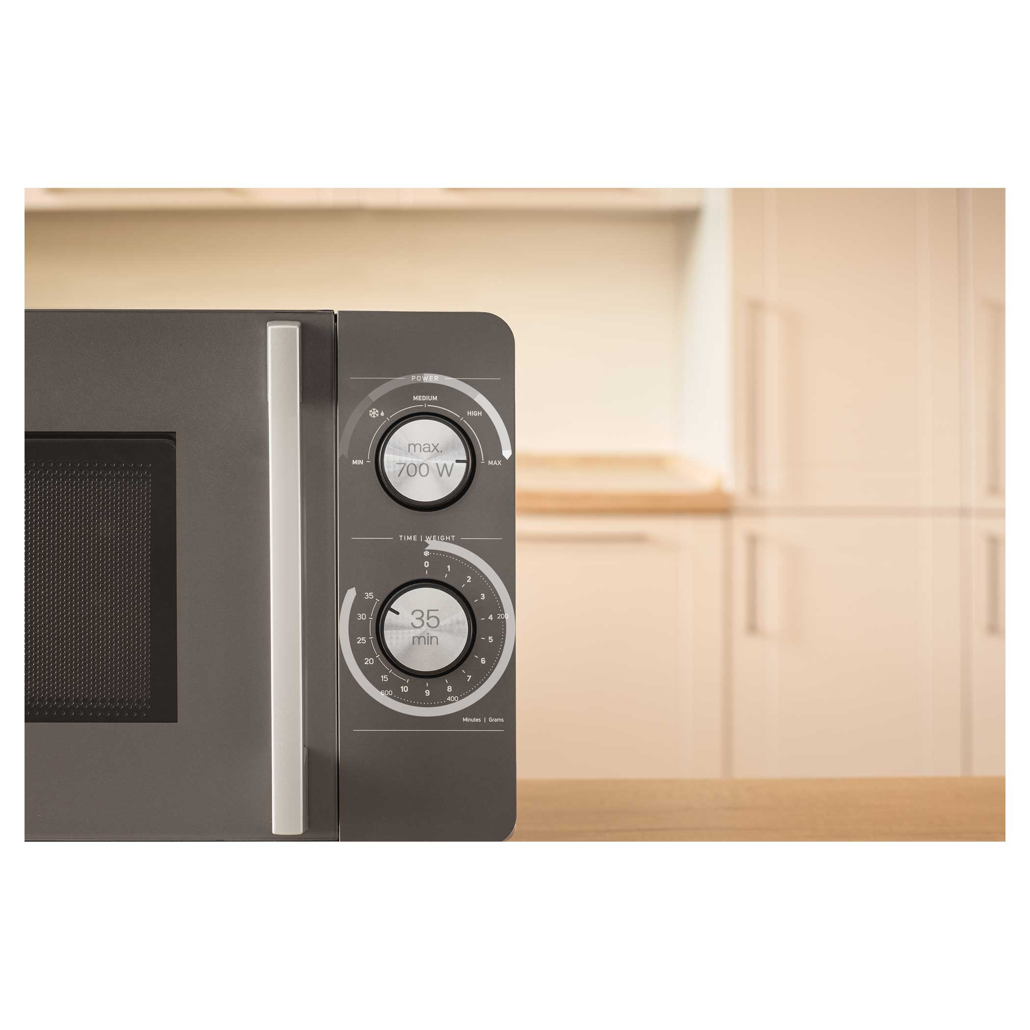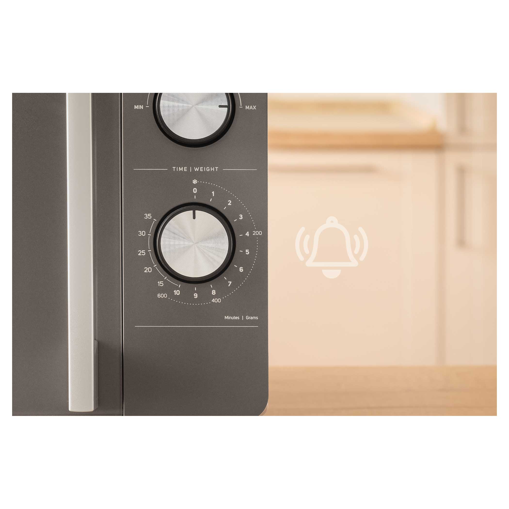 Ovládání je díky dvojici otočných knoflíků intuitivní – první knoflík slouží k nastavení jedné z 5 úrovní výkonu, druhý k nastavení času až na 35 minut. Už žádné složité programy, jednoduše stačí otočit a vařit, ohřívat nebo rozmrazovat.