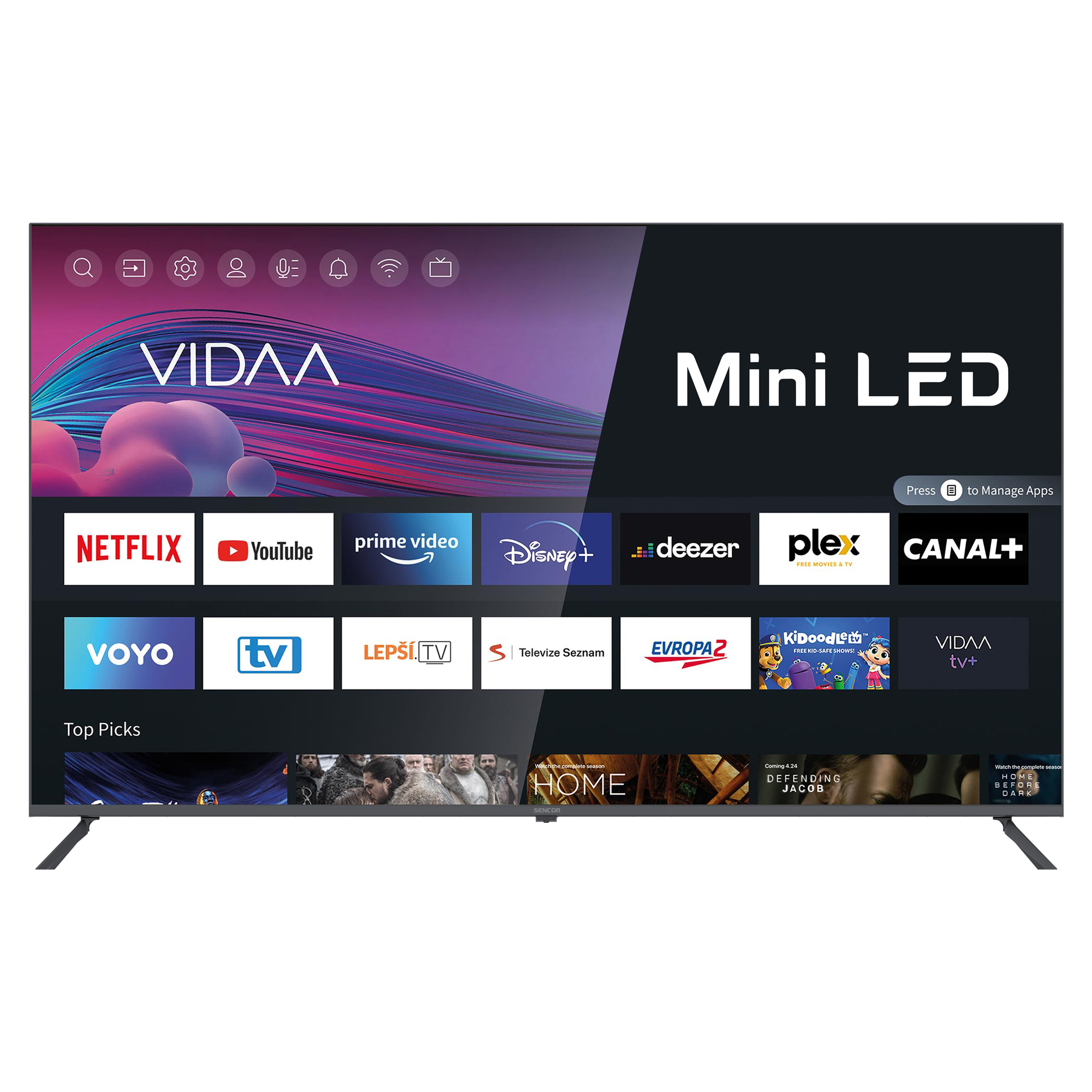 V televizorech SENCOR s operačním systémem VIDAA nechybí světové aplikace NETFLIX, DISNEY+, YOUTUBE, AMAZON PRIME a lokální VOYO, SledováníTV, Lepší.TV, Televize Seznam, Pohádky, ANTIK TV.Mirroring