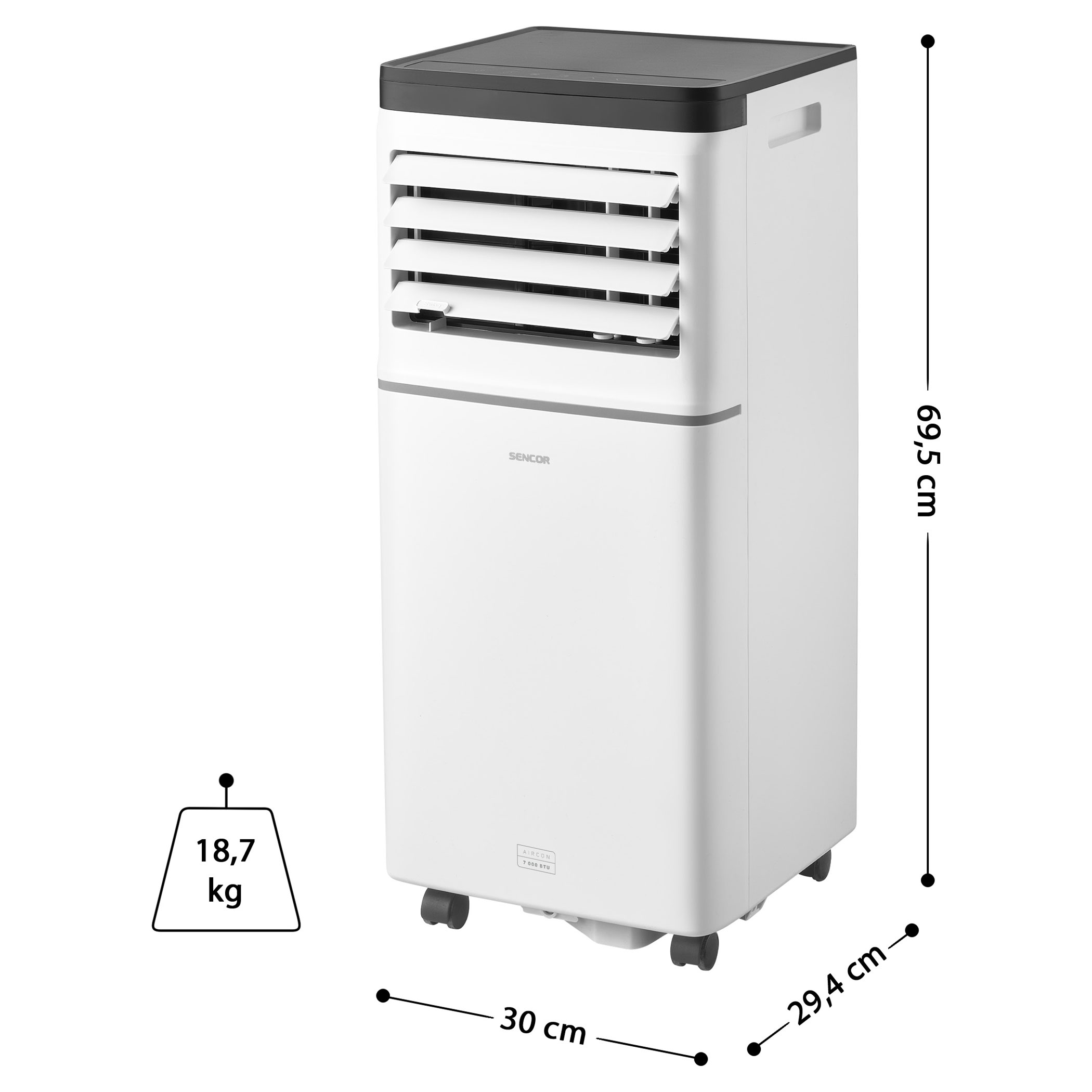 Tuto klimatizaci je možné ovládat hned 3 způsoby. Ke klasickému dálkovému ovladači nebo ovládání přímo z panelu klimatizace, přibyla možnost ovládat klimatizaci prakticky odkudkoli pomocí vašeho vlastního chytrého telefonu s aplikací Sencor HOME. Tam, kde máte na telefonu přístup k internetu, máte možnost připojit se ke své domácí síti a tedy i ovládat svou Wi-Fi klimatizace Sencor. A tak můžete mít doma příjemně třeba i rovnou po příchodu z práce nebo výletu. Díky Wi-Fi se klimatizace stane součástí vaší domácí sítě. Navíc jsme k Wi-Fi jsme přidali i Bluetooth. Bluetooth se postará hlavně o to, aby první instalace byla opravdu snadná a bezproblémová.Přes den chcete chladit pracovnu a na noc by se klimatizace hodila víc v ložnici? Snadný transport zajistí 4 kolečka a integrovaná rukojeť.
