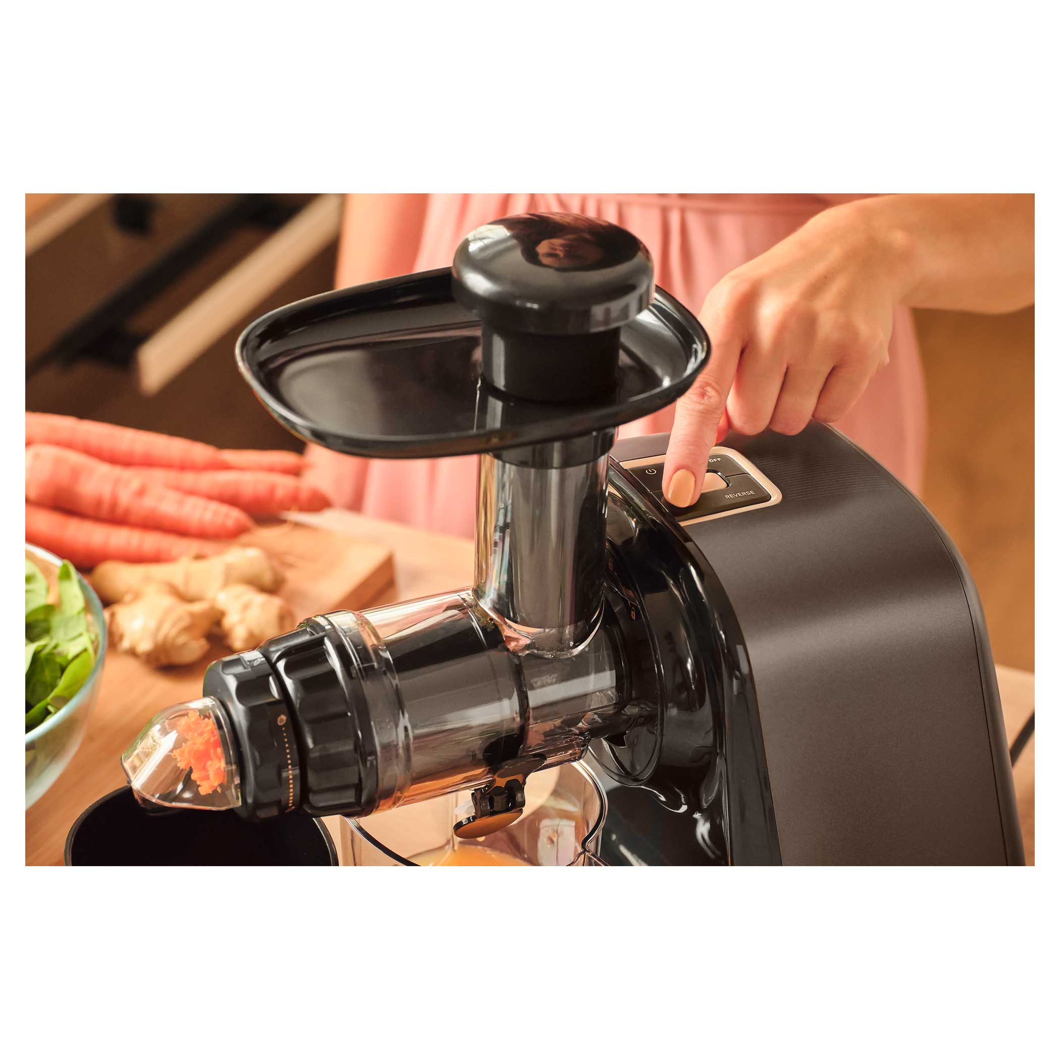 Pokud přístroj zahltíte, stačí zmáčknout tlačítko REV, které přepne motor do zpětného chodu, čímž rychle a snadno uvolníte zaseknuté suroviny.Z ovoce i zeleniny dostane maximum šťávy