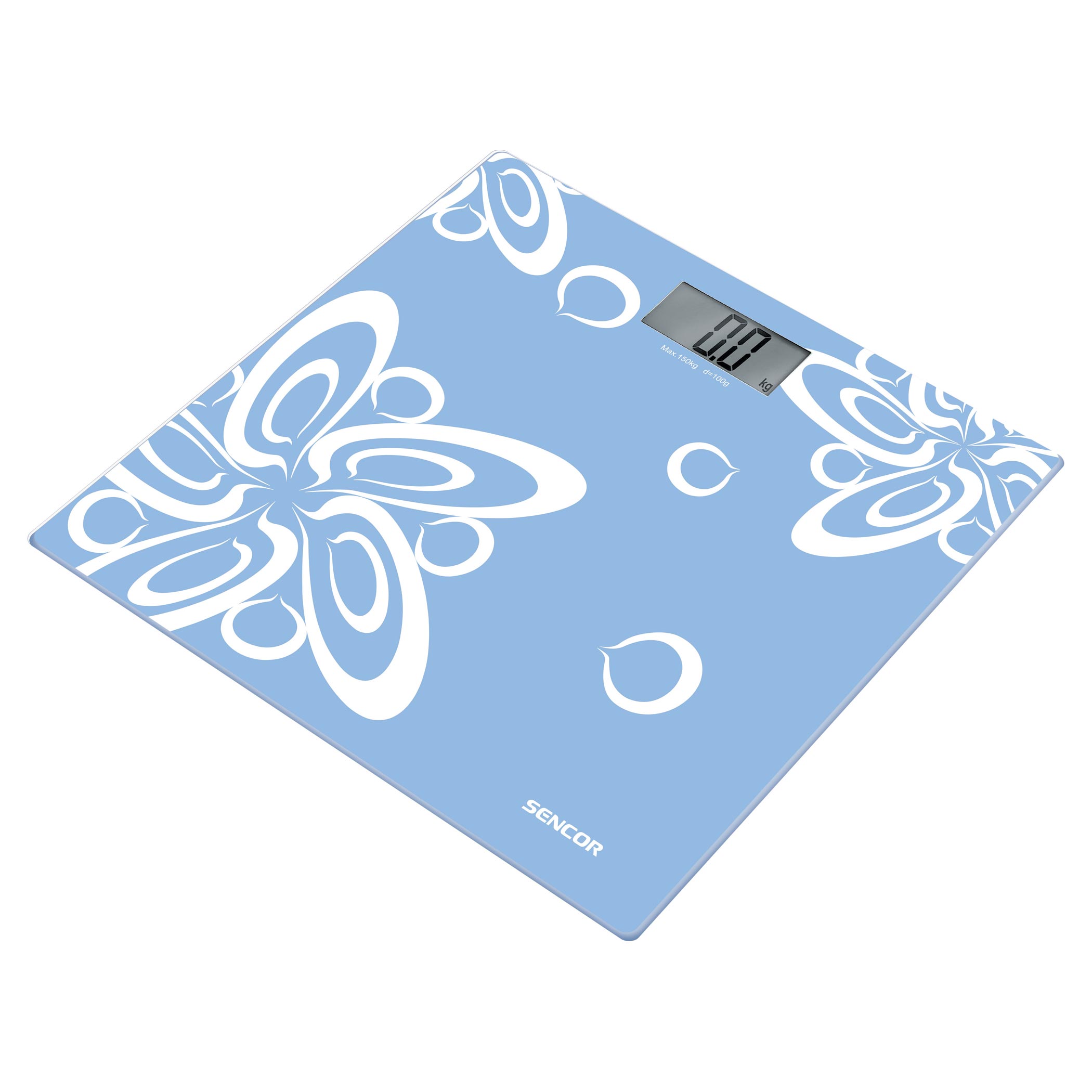 Osobní váha v moderním modrobílém květinovém designu se skleněným povrchem z tvrzeného bezpečnostního skla pro snadnou údržbu a váživostí do 150 kg.