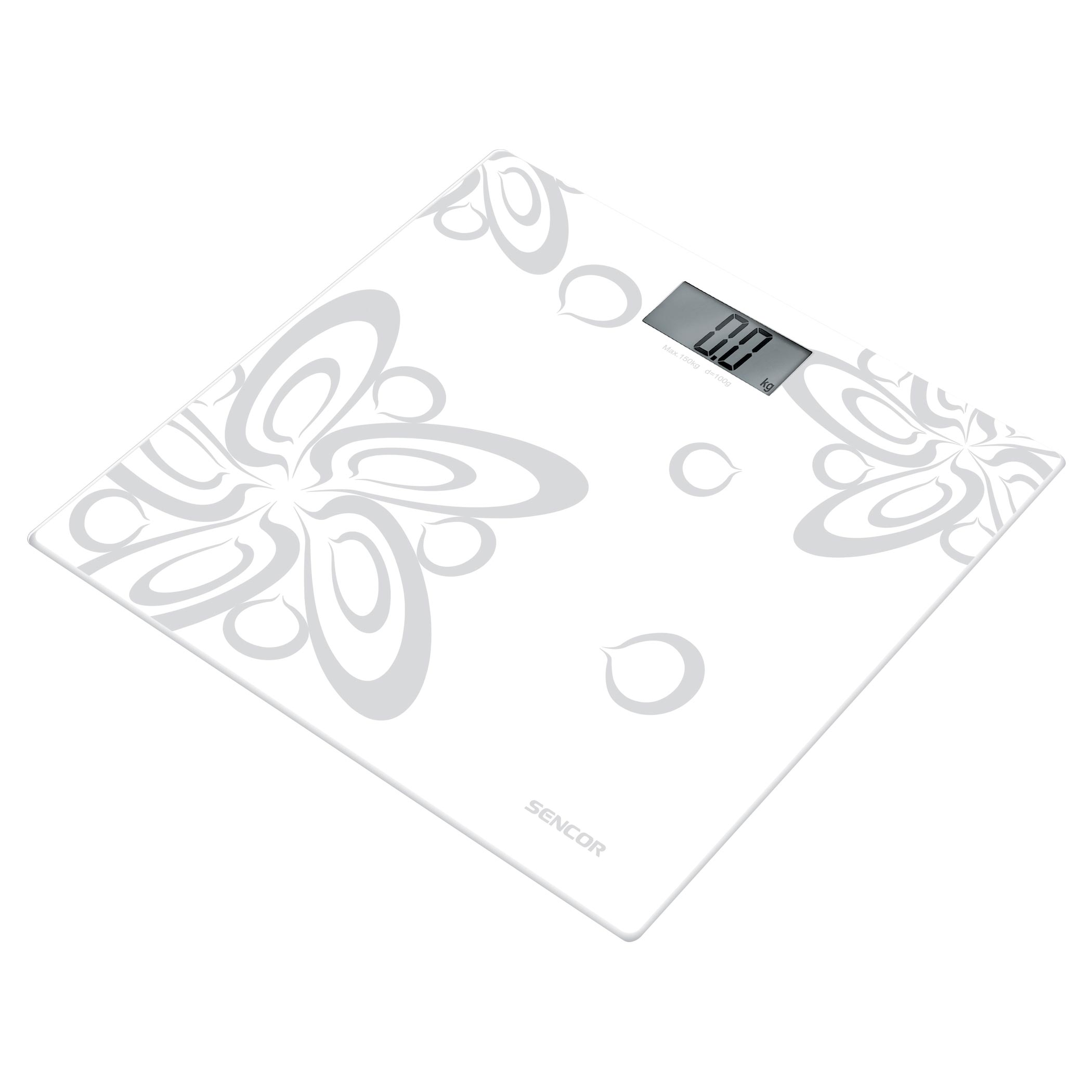 Osobní váha v moderním modrobílém květinovém designu se skleněným povrchem z tvrzeného bezpečnostního skla pro snadnou údržbu a váživostí do 150 kg.