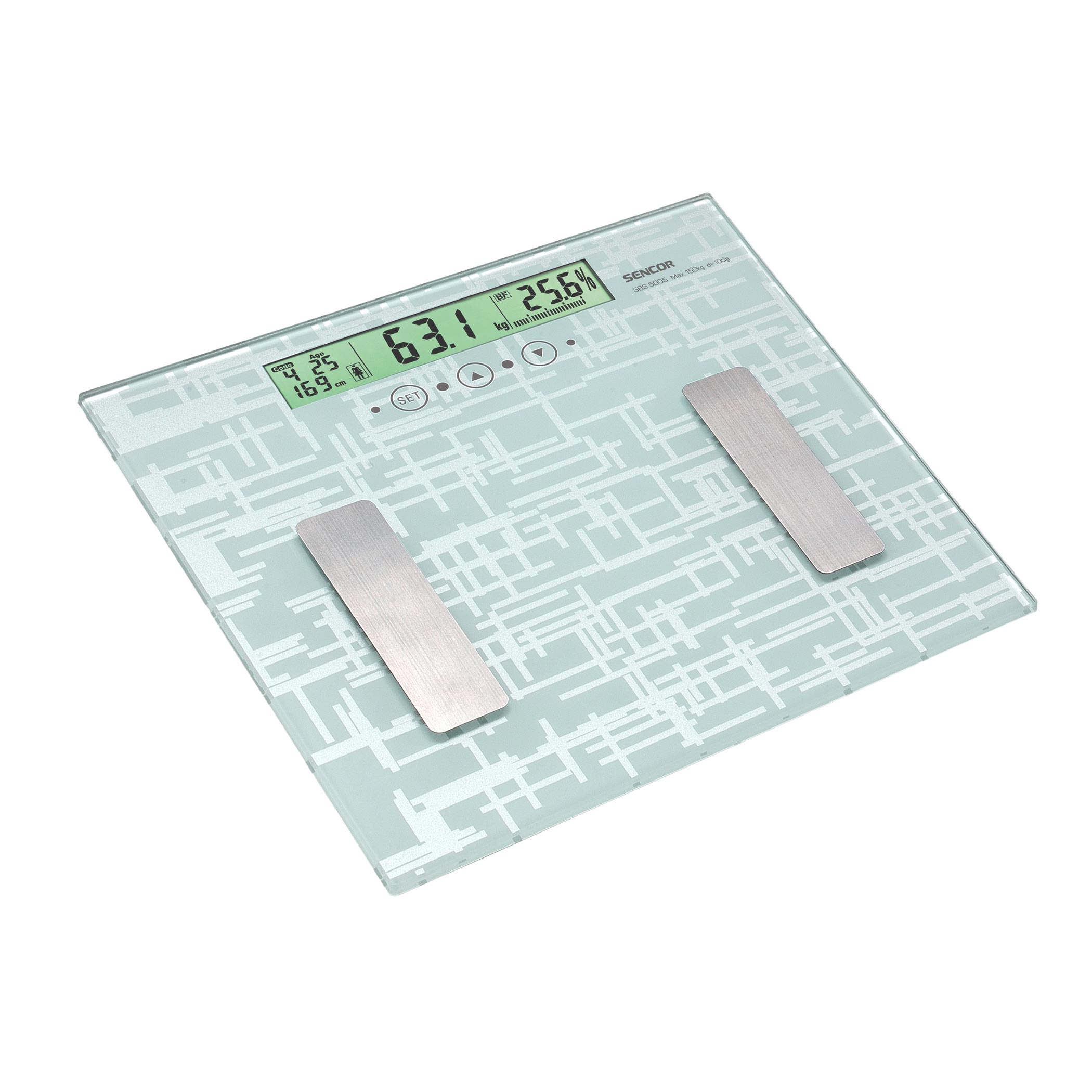 Váživost do 150 kg (rozlišení 100 g)Rozsah měření tuku: 4% - 60% (rozlišení 0,1%)