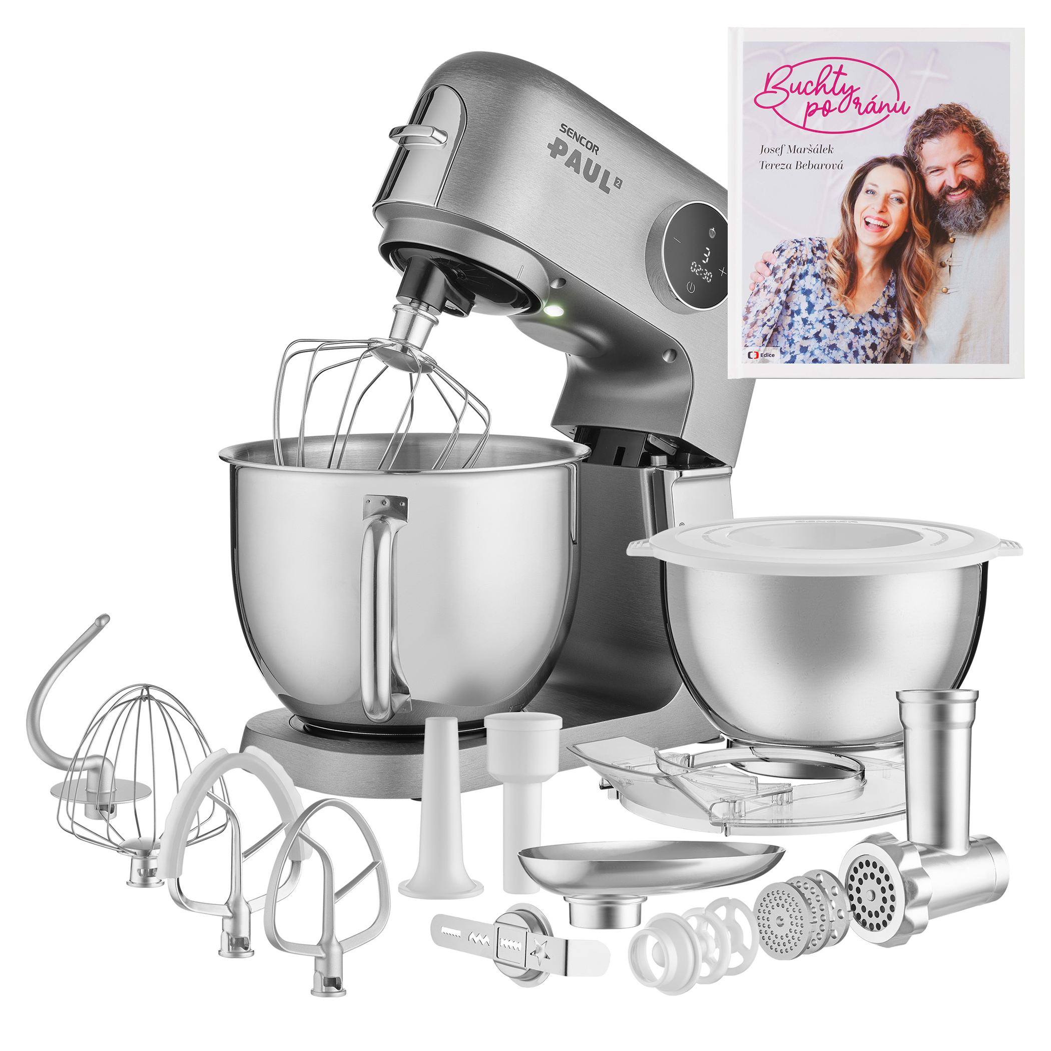 Příslušenství je vyrobené z kvalitní ušlechtilé oceli a je velmi pevné pro dlouhou životnost nástavců. Nerezové nádoby na míchání jsou dodávané ve 2 velikostech s maximálním objemem 6 l a 3,5 l i praktickými víky pro uchovávání surovin. Je také vybaven mlýnkem s bohatým příslušenstvím pro výrobu rozmanitých pochutin.Odolný hnětací hák