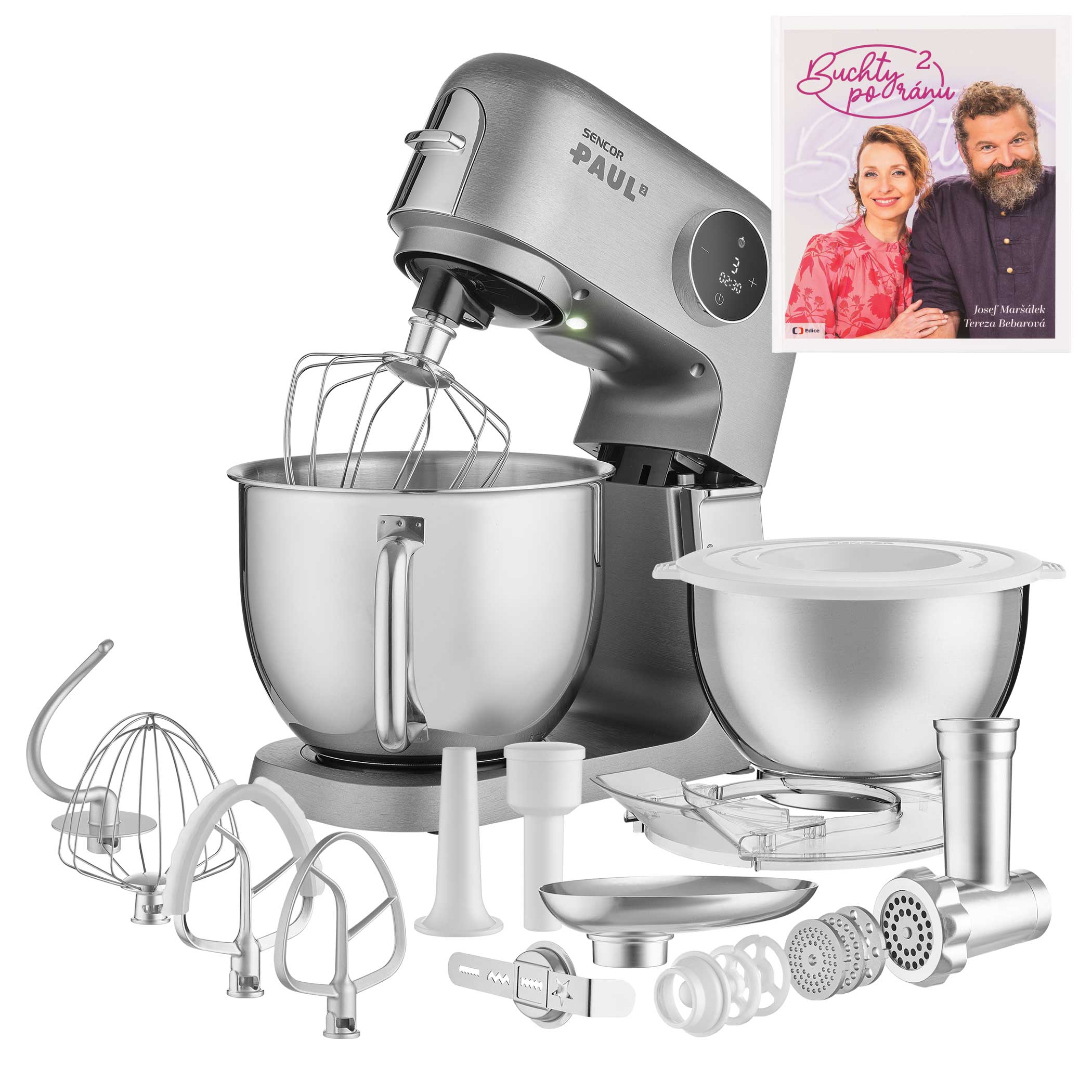 Příslušenství je vyrobené z kvalitní ušlechtilé oceli a je velmi pevné pro dlouhou životnost nástavců. Nerezové nádoby na míchání jsou dodávané ve 2 velikostech s maximálním objemem 6 l a 3,5 l i praktickými víky pro uchovávání surovin. Je také vybaven mlýnkem s bohatým příslušenstvím pro výrobu rozmanitých pochutin.