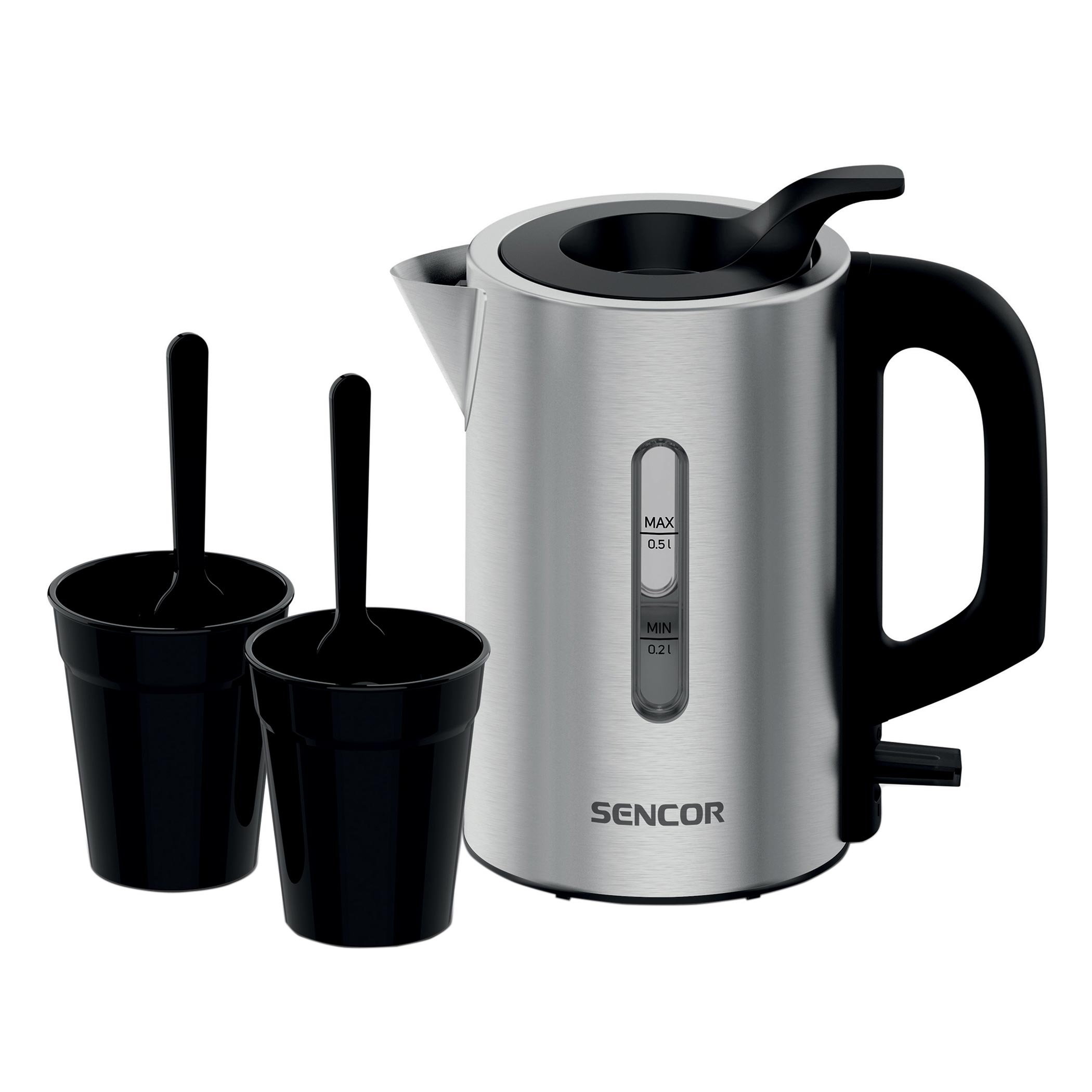 Díky objemu 0,5 litrů vody je konvice Sencor velmi skladná a hodí se i do vybavení karavanu či třeba na kempování. Součástí balení jsou 2 praktické šálky a lžičky neobsahující BPA, které vám zpříjemní přípravu oblíbeného nápoje.Nerezový design