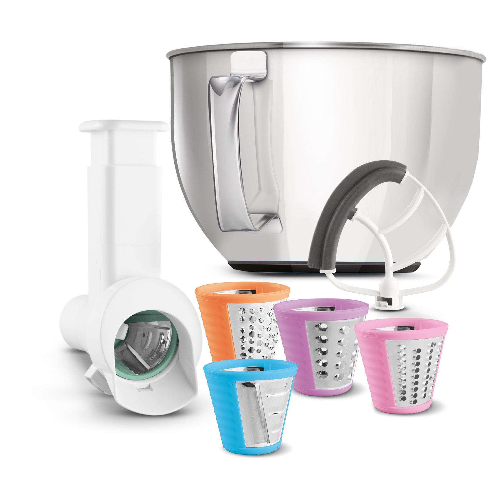 - Krouhač a strouhač, míchací metla, nerezová nádoba o objemu 4,5 l