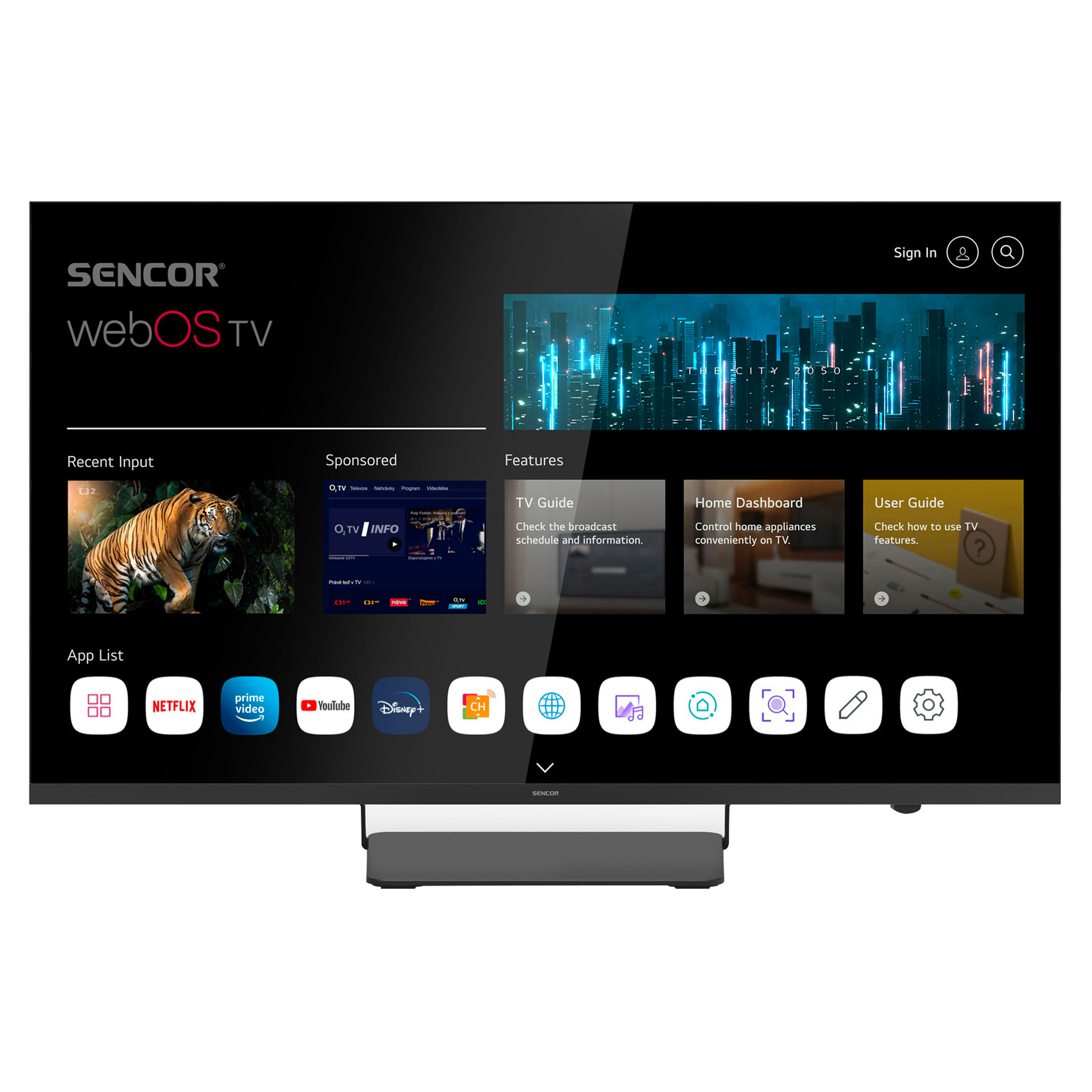 Systém WebOS, zkušenostmi ověřený operační systém vyvinutý společností LG, je velice uživatelsky komfortní, svižný a intuitivní. Pokud jde o zastoupení aplikací, ty nejdůležitější v tomto operačním systému nechybí. Rovněž máte přístup do filmoték Netflix či Amazon Prime video Skylink live TV a nechybí ani přístup ke službám IPTV poskytovatelů. Systém běží na čtyř jádrovém procesoru ARM Cortex.