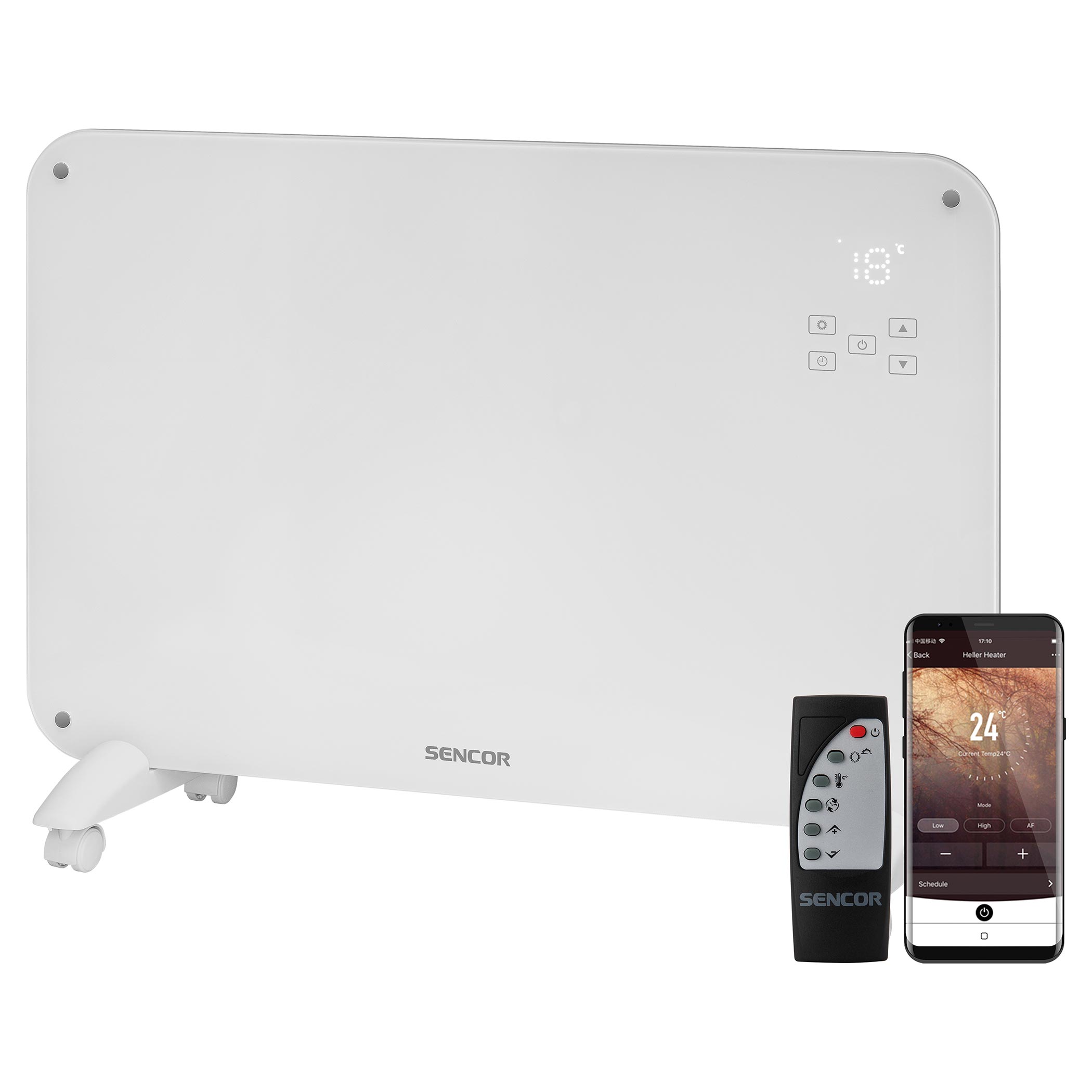 Nabízím tři způsoby ovládání. Jsem vybaven dotykovým LCD displejem, na kterém mi můžete nastavit jednotlivé režimy, funkce i teplotu a zároveň sledovat mou současnou činnost. Dálkovým ovladačem mě můžete ovládat přímo z pohovky a díky mobilní aplikaci Sencor TuyaSmart už nemusíte být ani doma. Díky ní se zahřejete ihned po příchodu z práce nebo výletu. Mobilní aplikací umožňuji plné ovládání mimo váš domov, stačí vám datové připojení na telefonu.Pracuji úsporně, a přitom jsem rychlíkem v nahřívání
