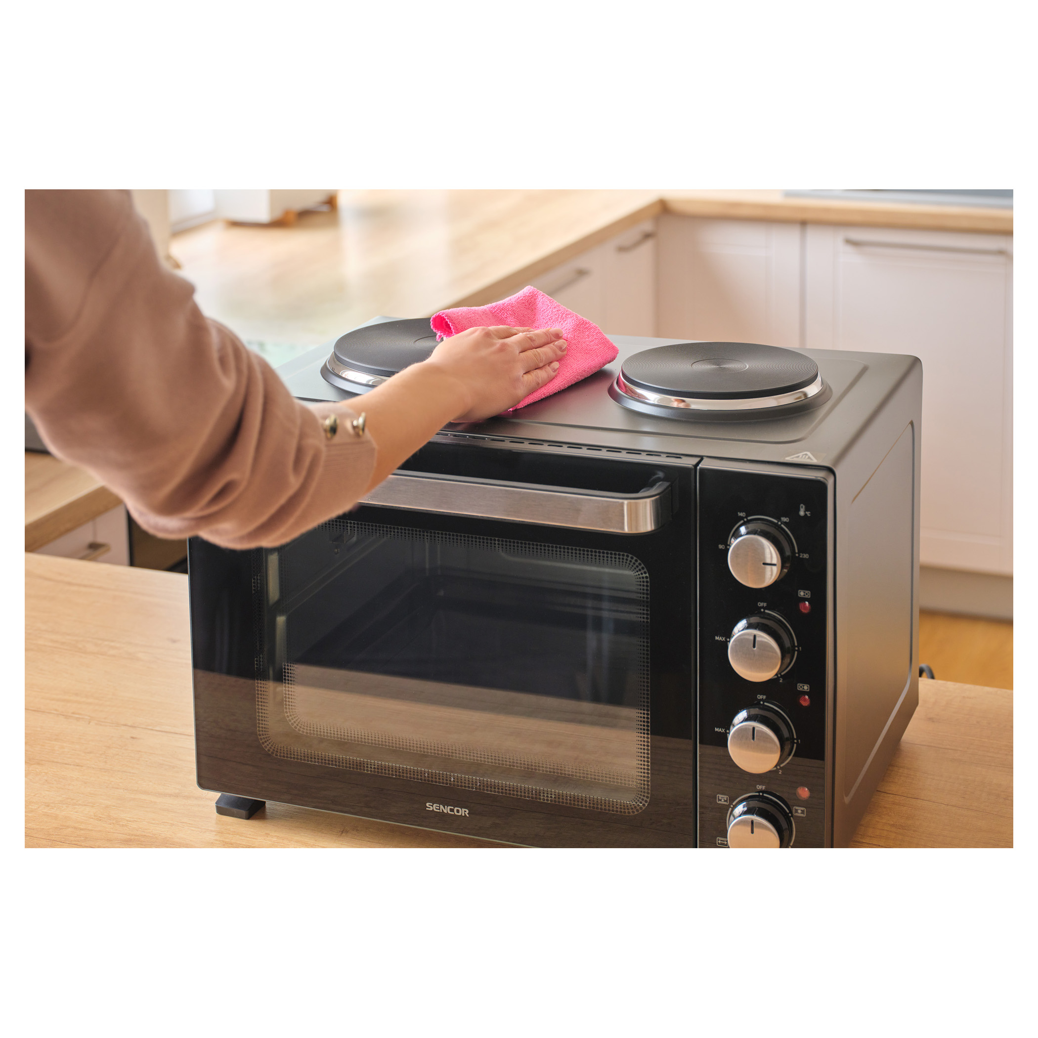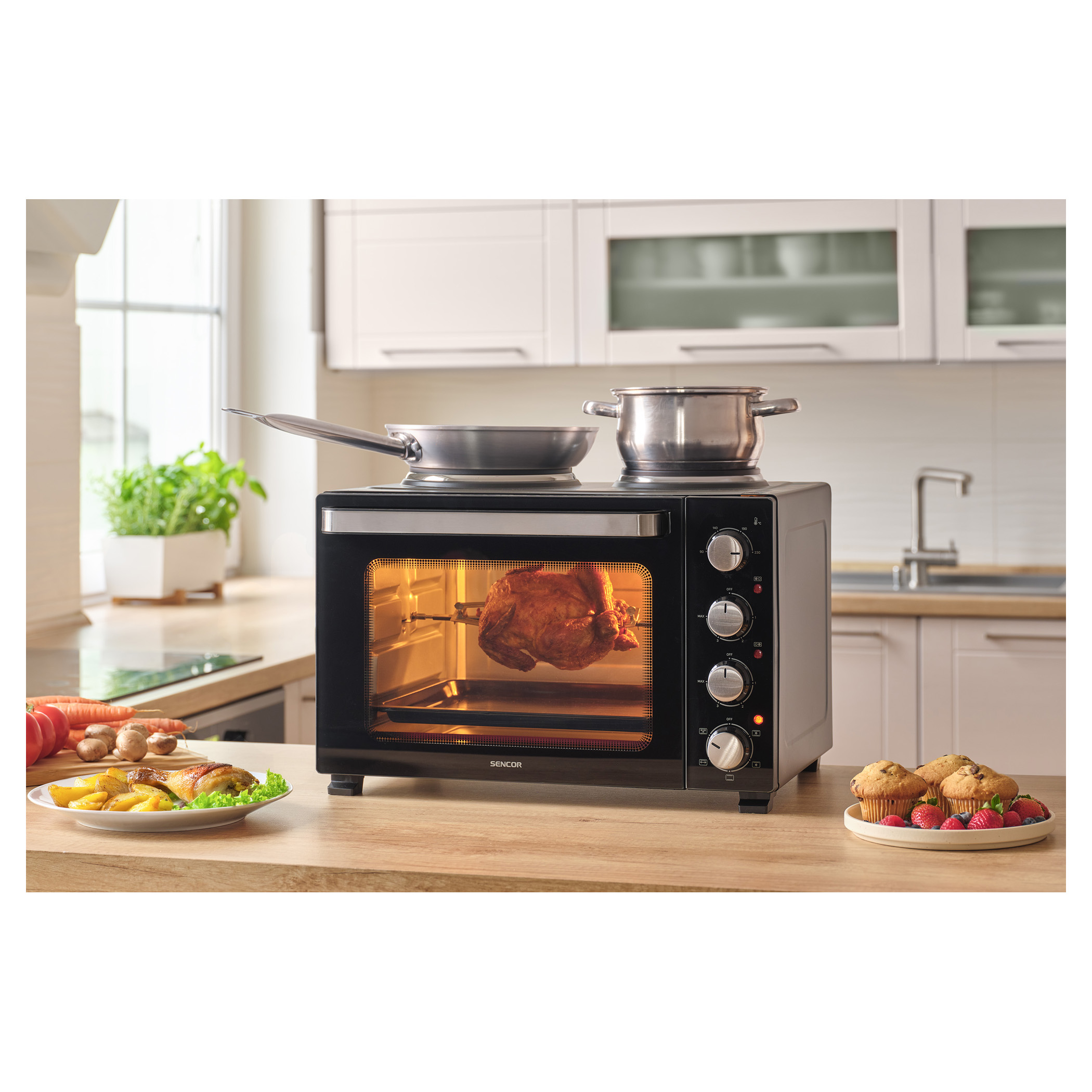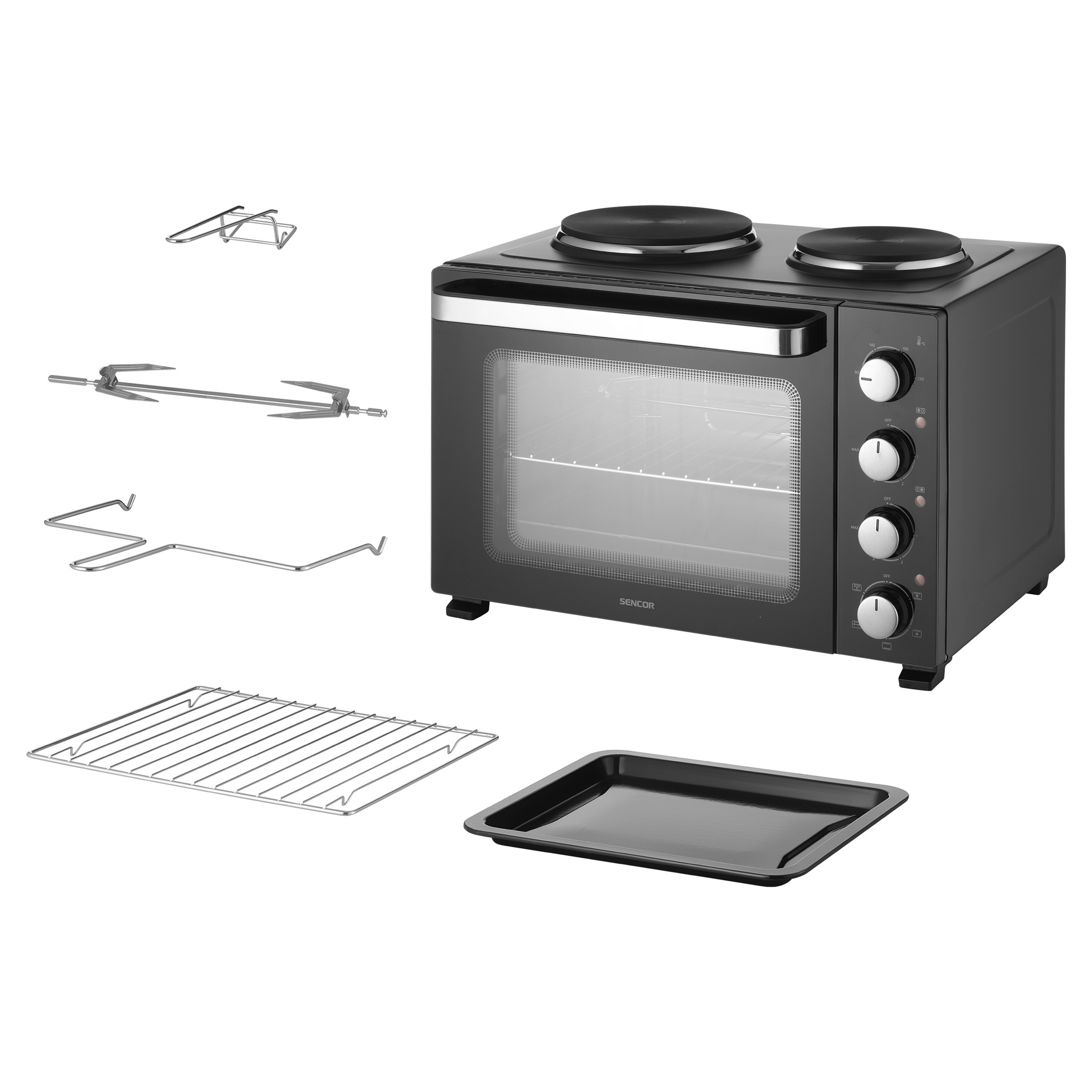 Elektrická trouba s plotýnkami Sencor SEO 3500BK si hravě poradí s vařením polévek, přípravou omáček, zapékáním těstovin i pečením celého kuřete díky celkovému příkonu 3 200 W a objemu 35 l. Pohodlné nastavení umožňují 4 otočné ovladače. O aktuálním provozu plotýnek i trouby vás informují 3 samostatné kontrolky.Hlavní body produktu: