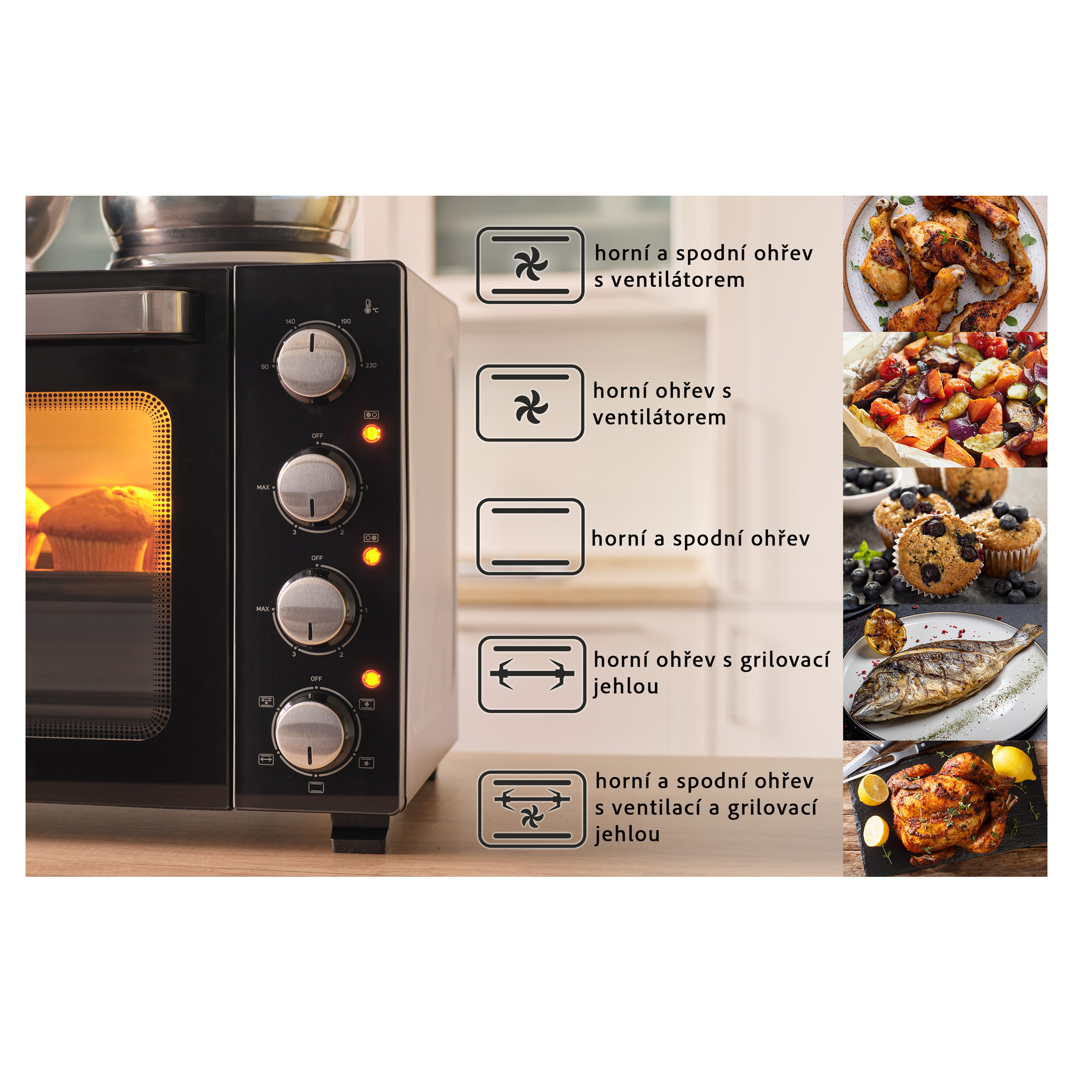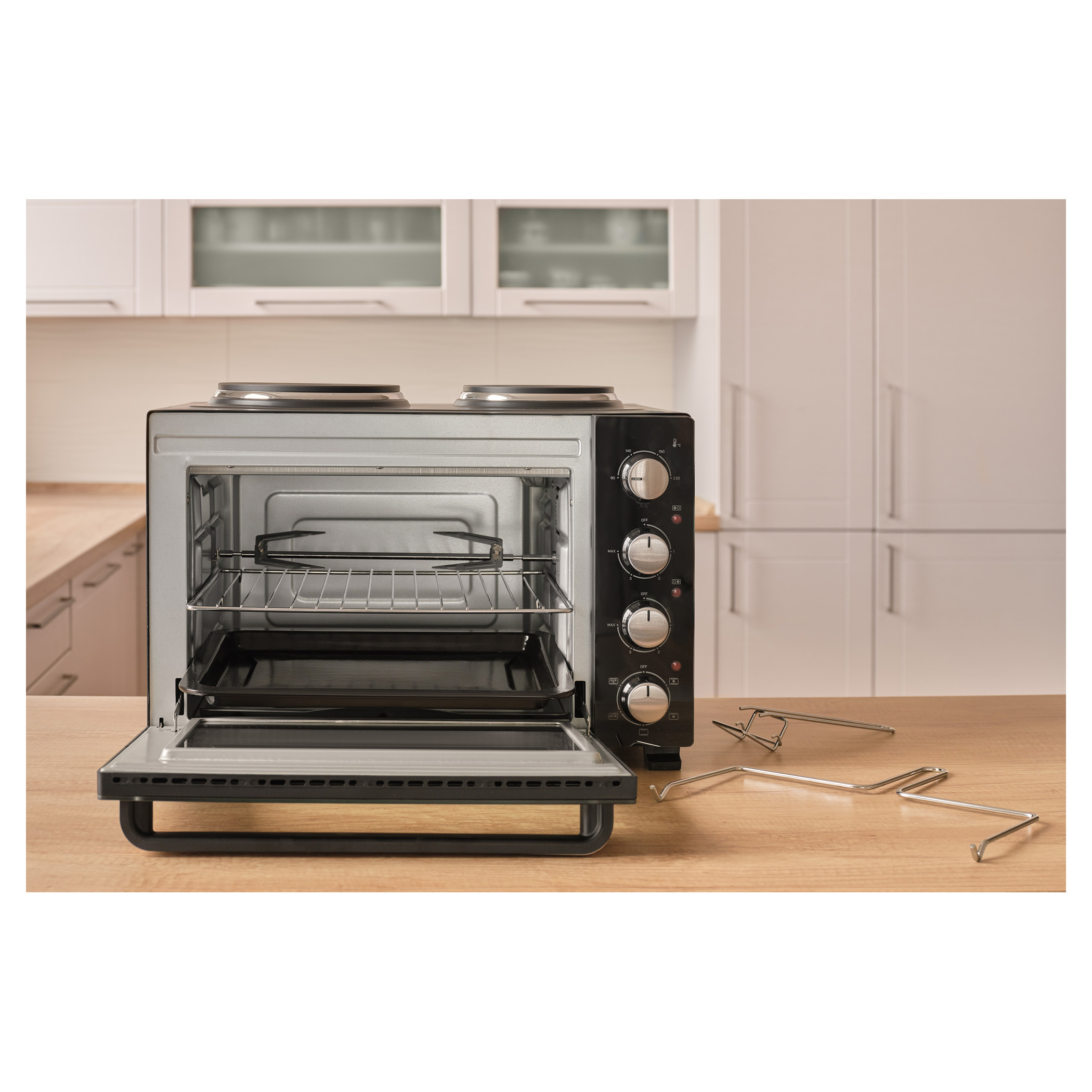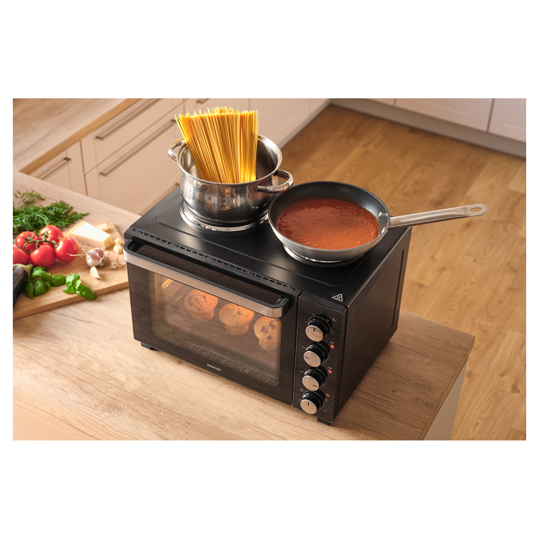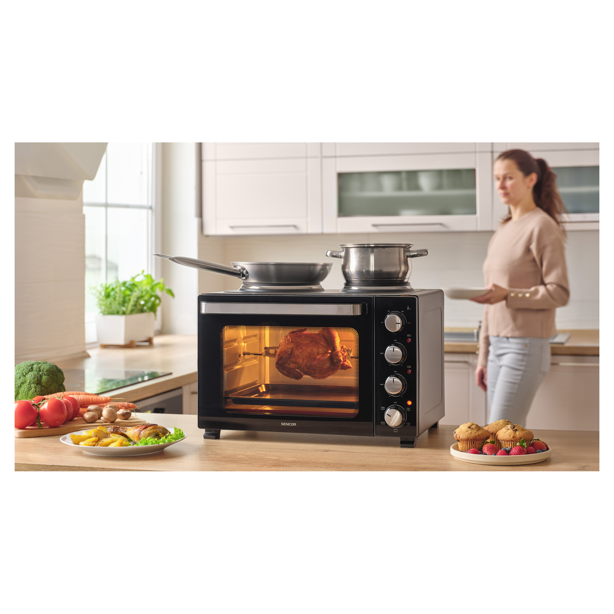 Elektrická trouba s plotýnkami Sencor SEO 3500BK si hravě poradí s vařením polévek, přípravou omáček, zapékáním těstovin i pečením celého kuřete díky celkovému příkonu 3 200 W a objemu 35 l. Pohodlné nastavení umožňují 4 otočné ovladače. O aktuálním provozu plotýnek i trouby vás informují 3 samostatné kontrolky.Hlavní body produktu: