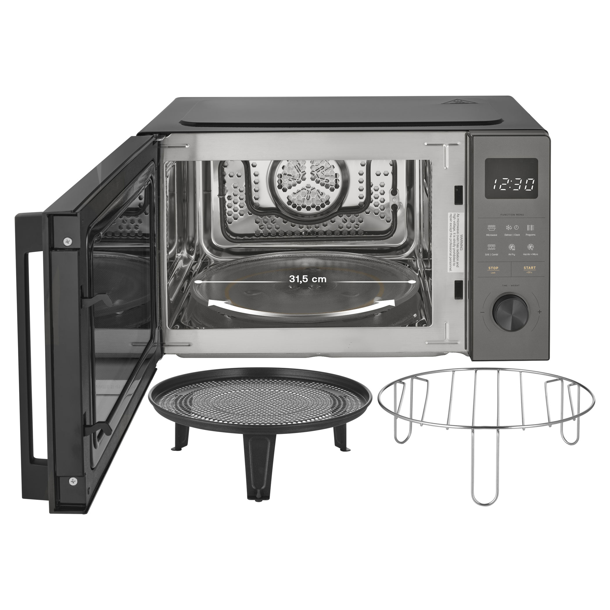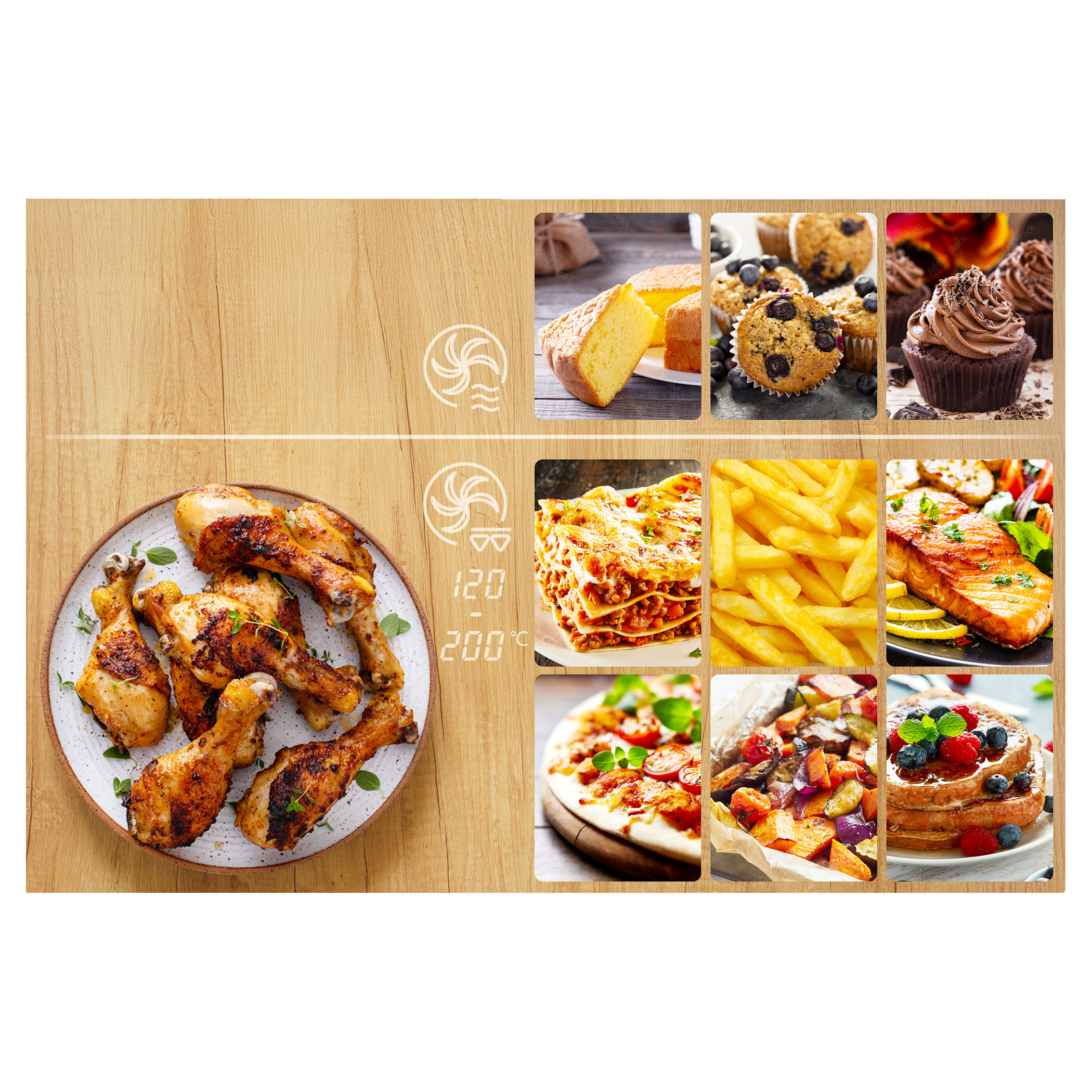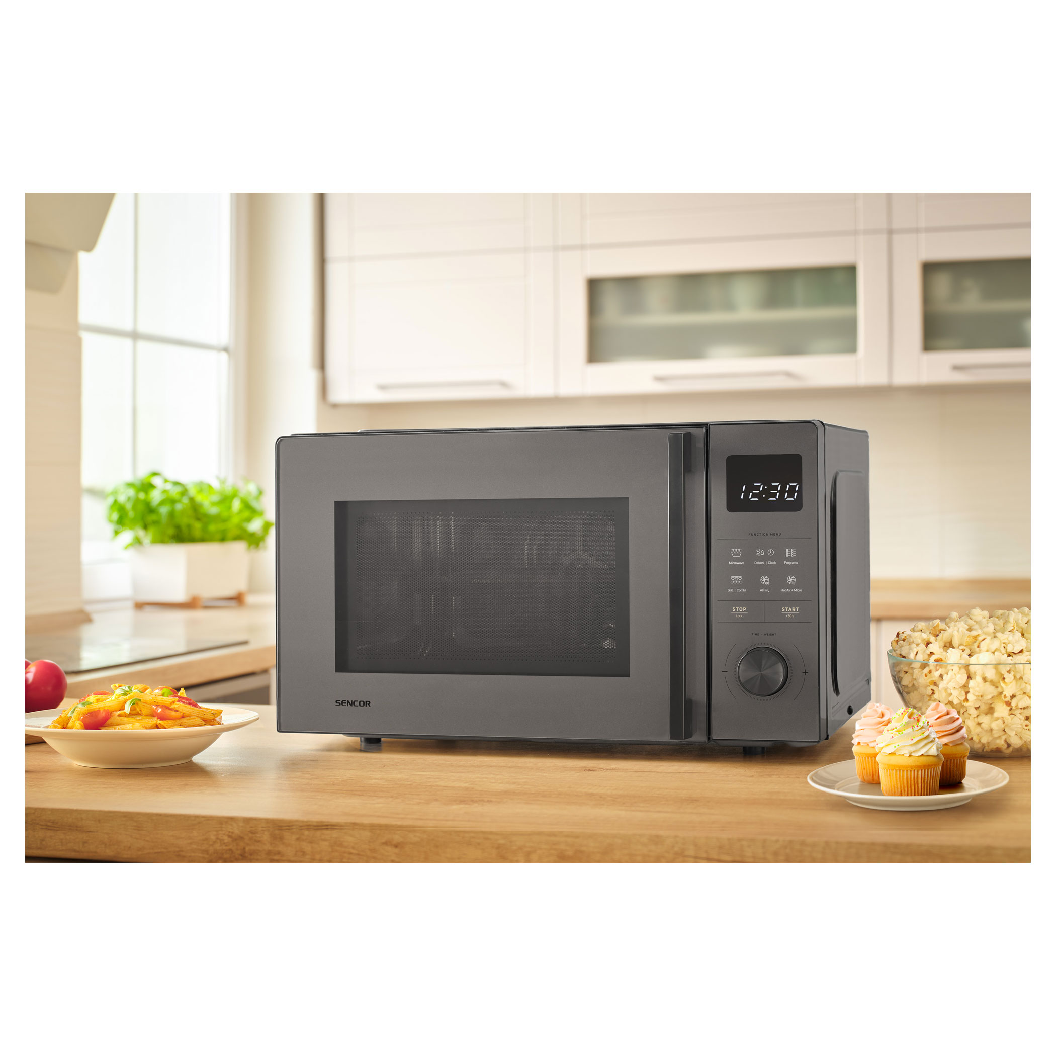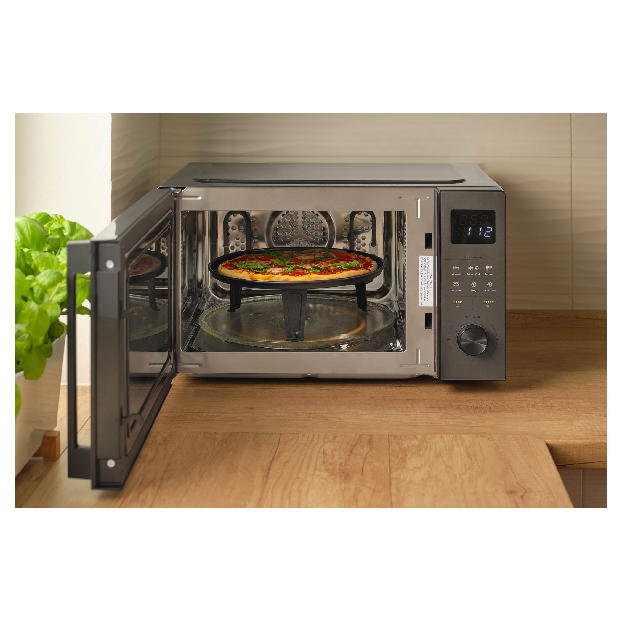 Mikrovlnná trouba zvládne s funkcí grilu a horkovzdušné fritézy připravit řadu rozmanitých pokrmů, například křupavé hranolky, šťavnaté kuřecí paličky nebo zapečené lasagne. Díky kombinovanému režimu mikrovln a horkého vzduchu je vhodná i na pečení nadýchaného piškotového korpusu, cupcaků apod.