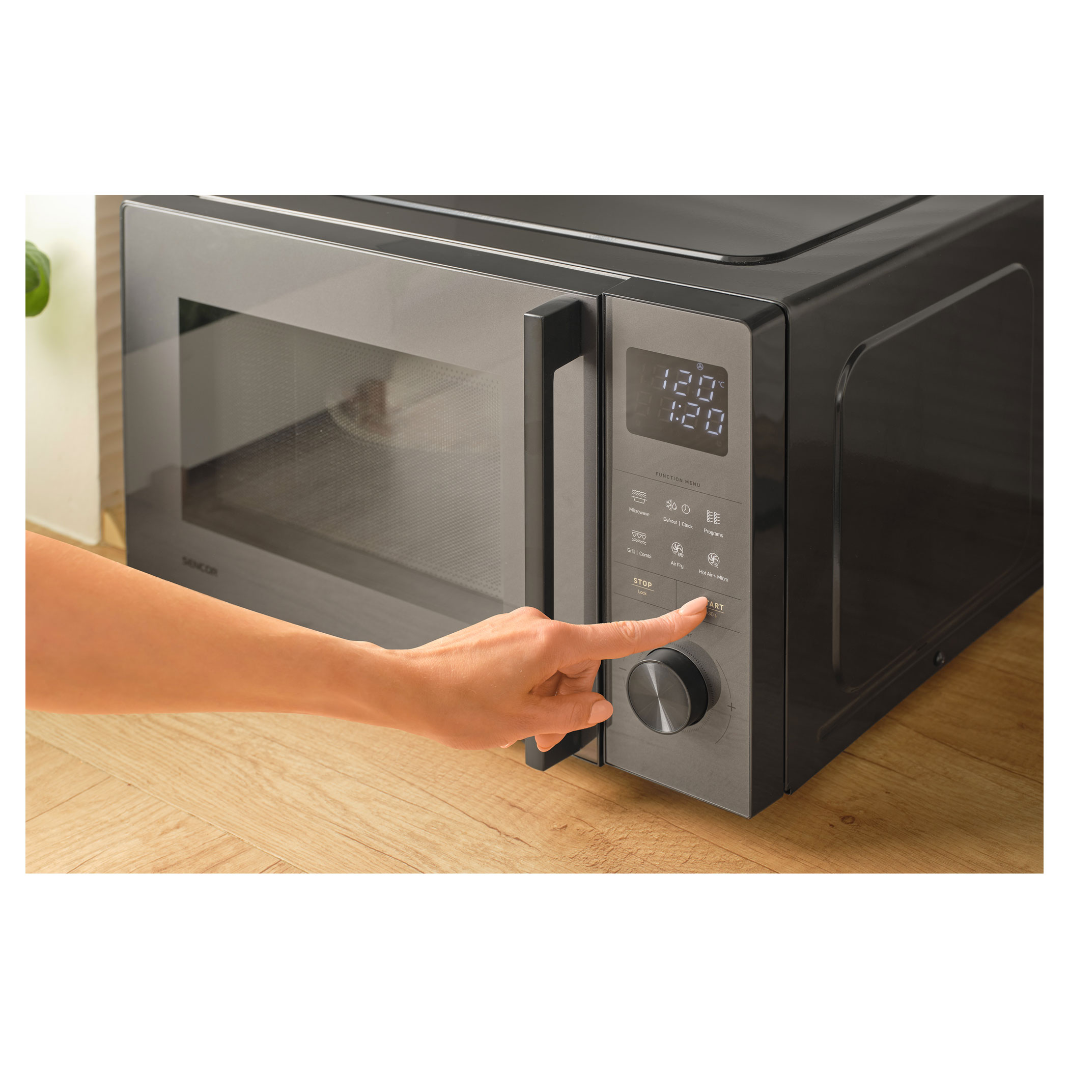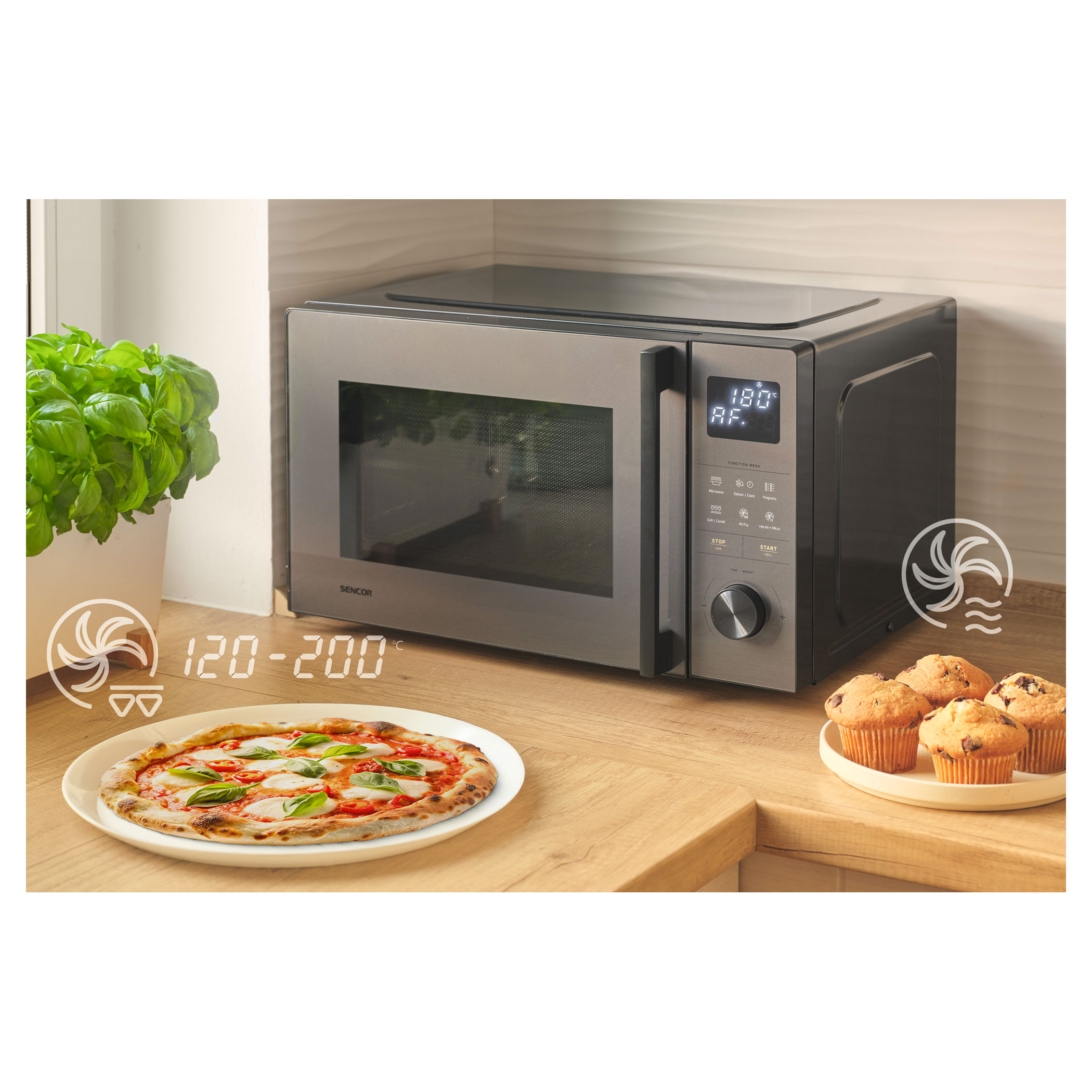 U režimu horkovzdušné fritézy si snadno nastavíte teplotu od 120 do 200 °C. Jídla budou rovnoměrně propečená a s křupavým povrchem. Kombinace mikrovln a horkého vzduchu je ideální pro pečení piškotového těsta, muffinů i slaných pokrmů.