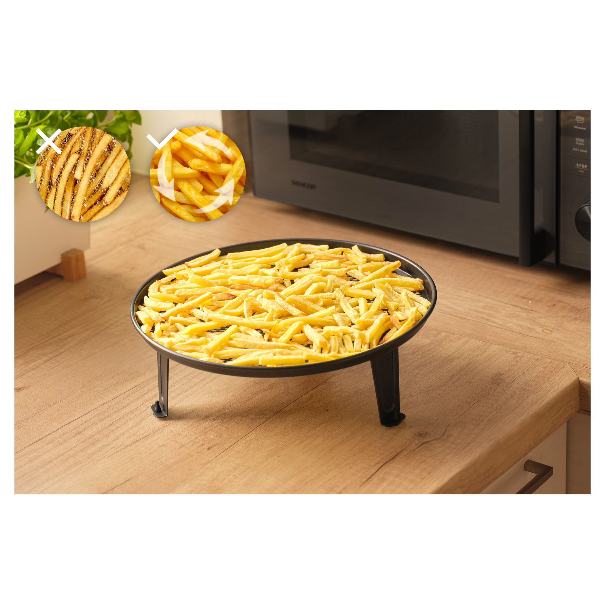 Mikrovlnná trouba je vybavena speciálně navrženým pečicím roštem pro režim horkovzdušné fritézy, který umožňuje rovnoměrnou cirkulaci horkého vzduchu kolem pokrmu.