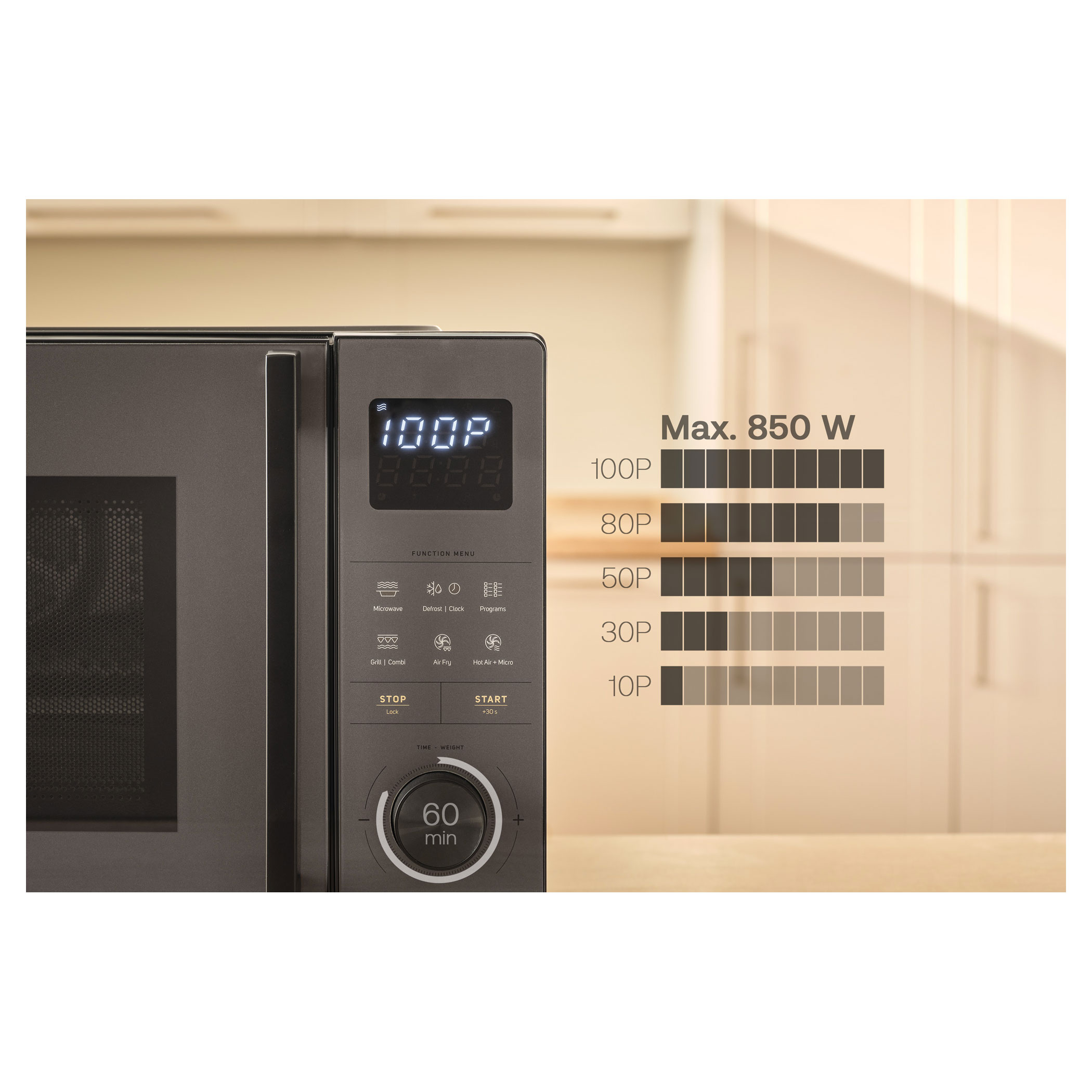 Díky 5 úrovním mikrovlnného výkonu si přesně přizpůsobíte ohřev podle typu připravovaného pokrmu. K dispozici máte také 60minutový časovač. S využitím funkce Rychlého startu se vyhnete nastavování výkonu a času a okamžitě spustíte ohřev při plném výkonu.