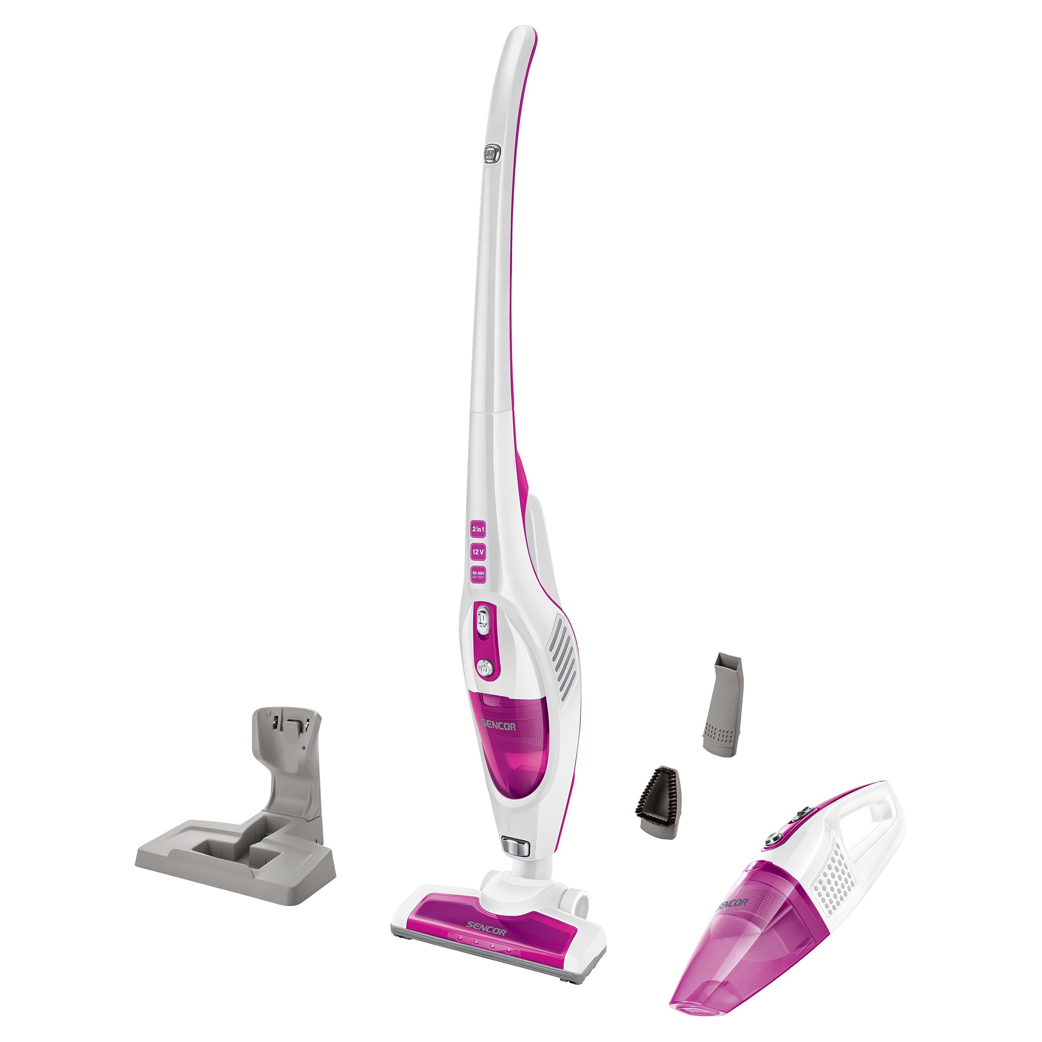 - Nabíjecí základna pro praktické uložení vysavače je opatřena integrovaným držákem příslušenství