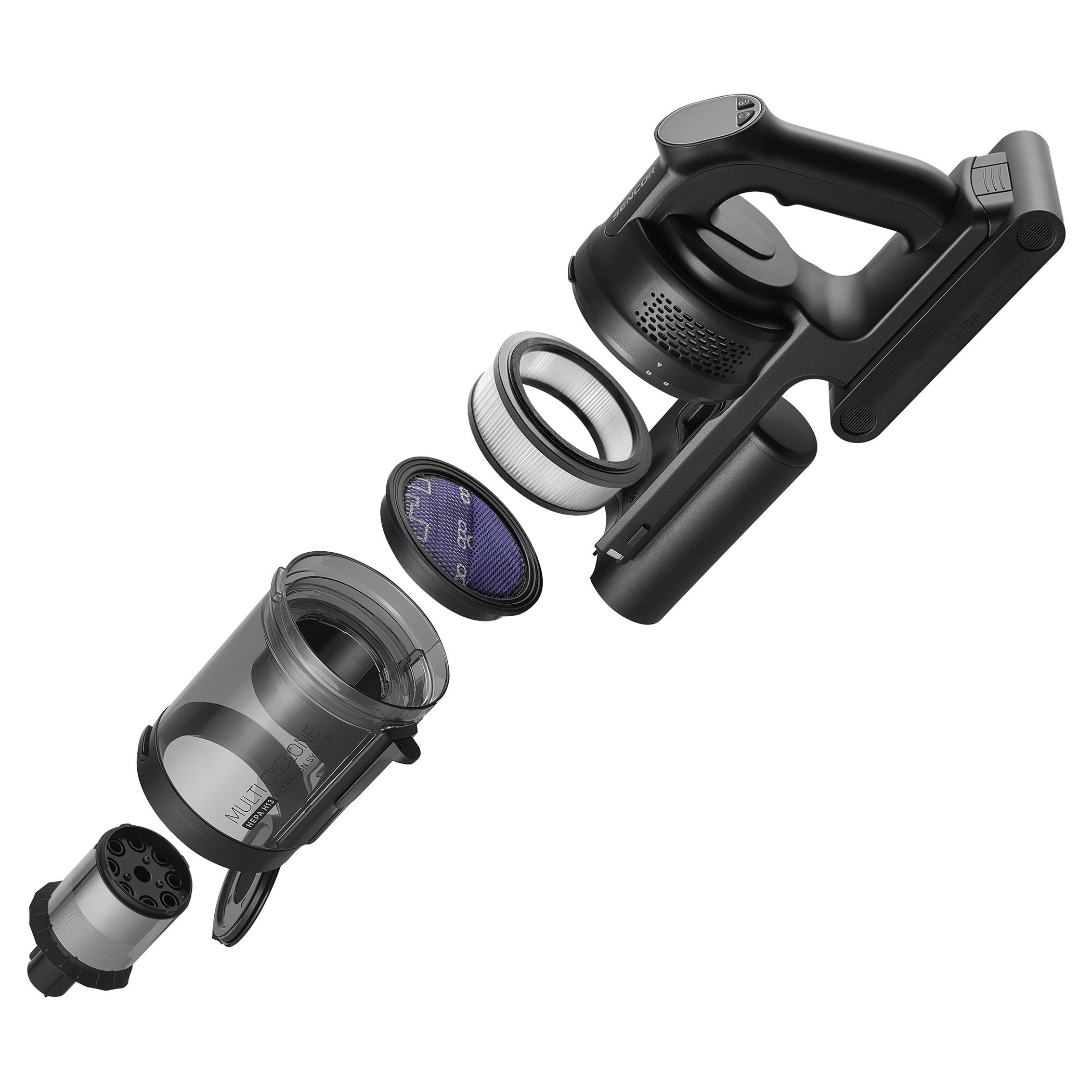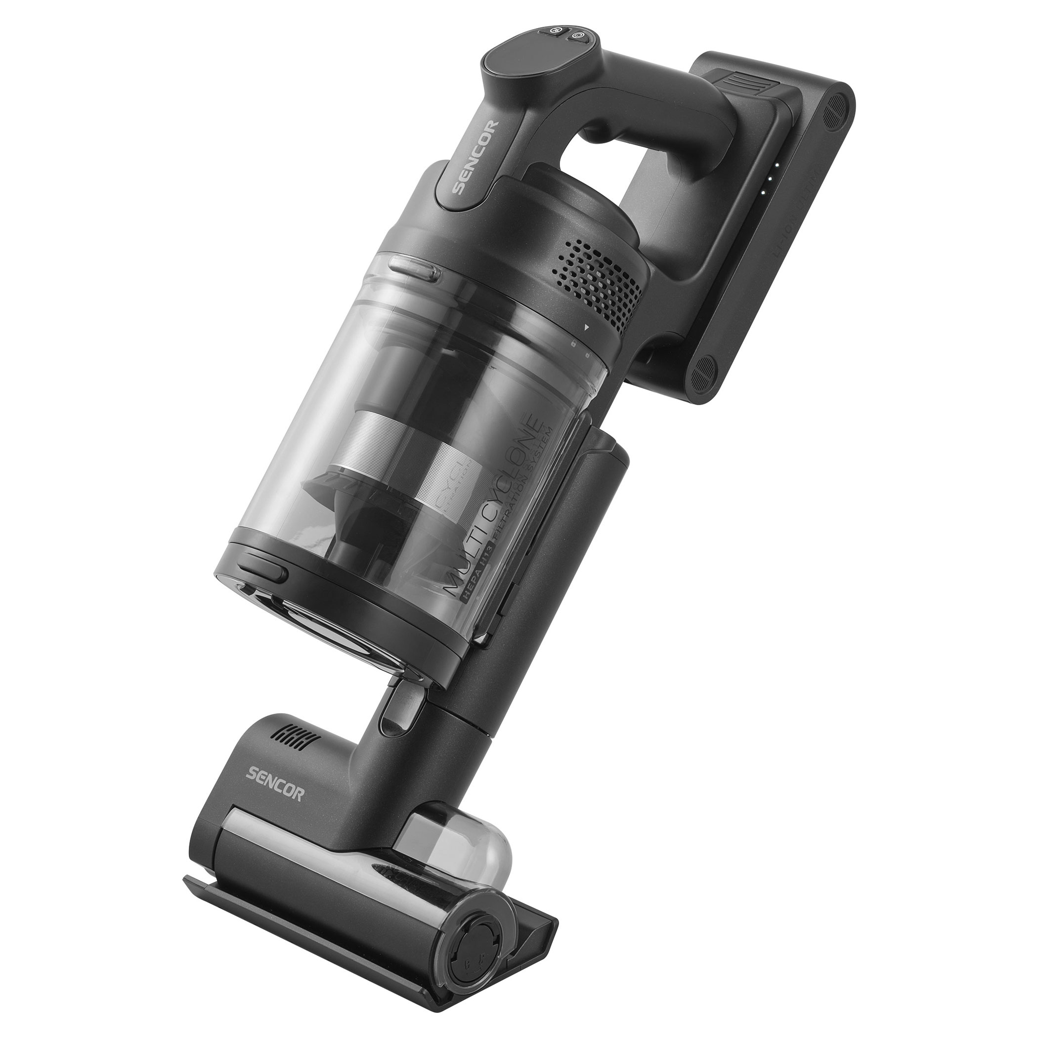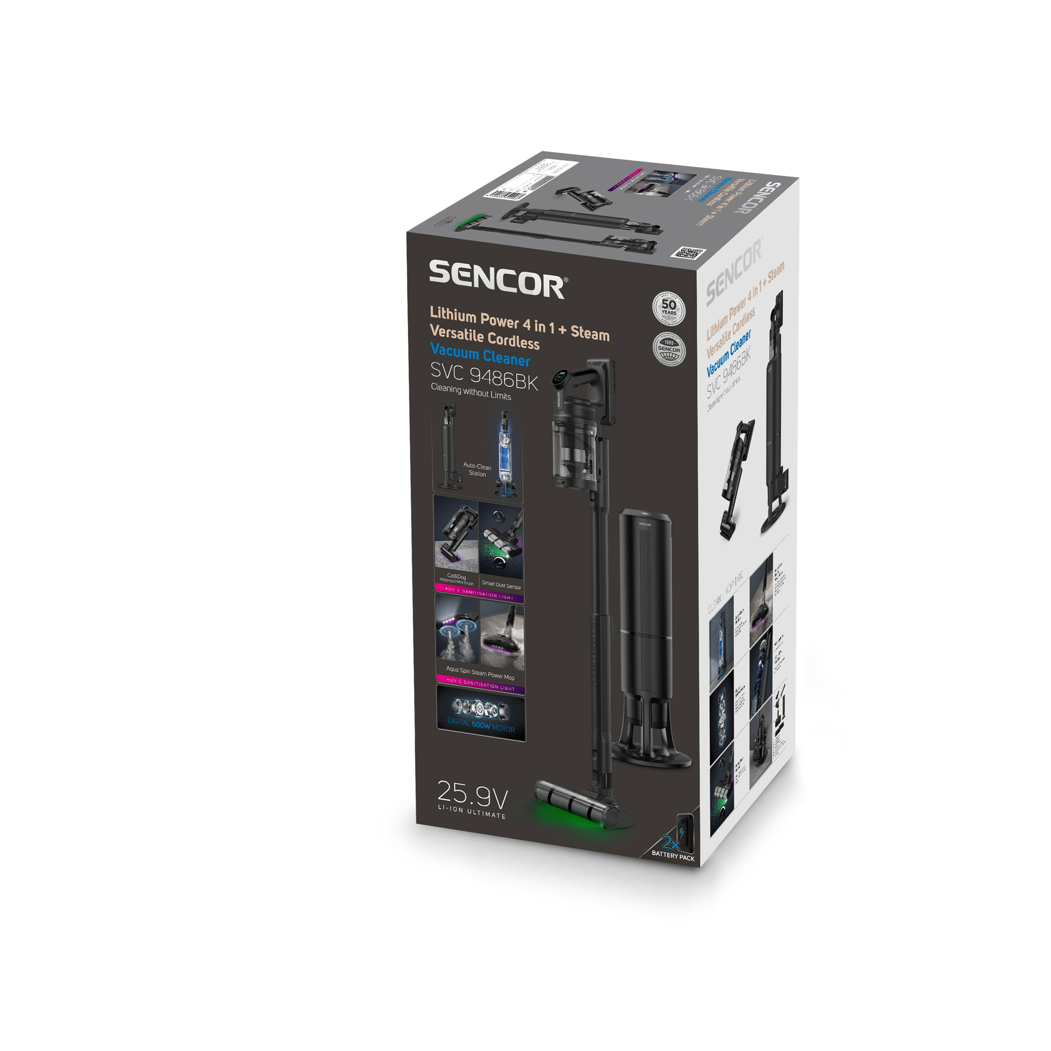 SVC 9486BK využívá 500W digitální motor a multicyklónovou filtraci s HEPA H13 pro vysoký a trvalý sací výkon. Smart Dust Sensor automaticky reguluje tah podle míry znečištění, čímž optimalizuje spotřebu a prodlužuje provoz. V balení jsou dvě Li-ion baterie s kapacitou 3 000 mAh a napětím 25,9 V, které umožňují výdrž až