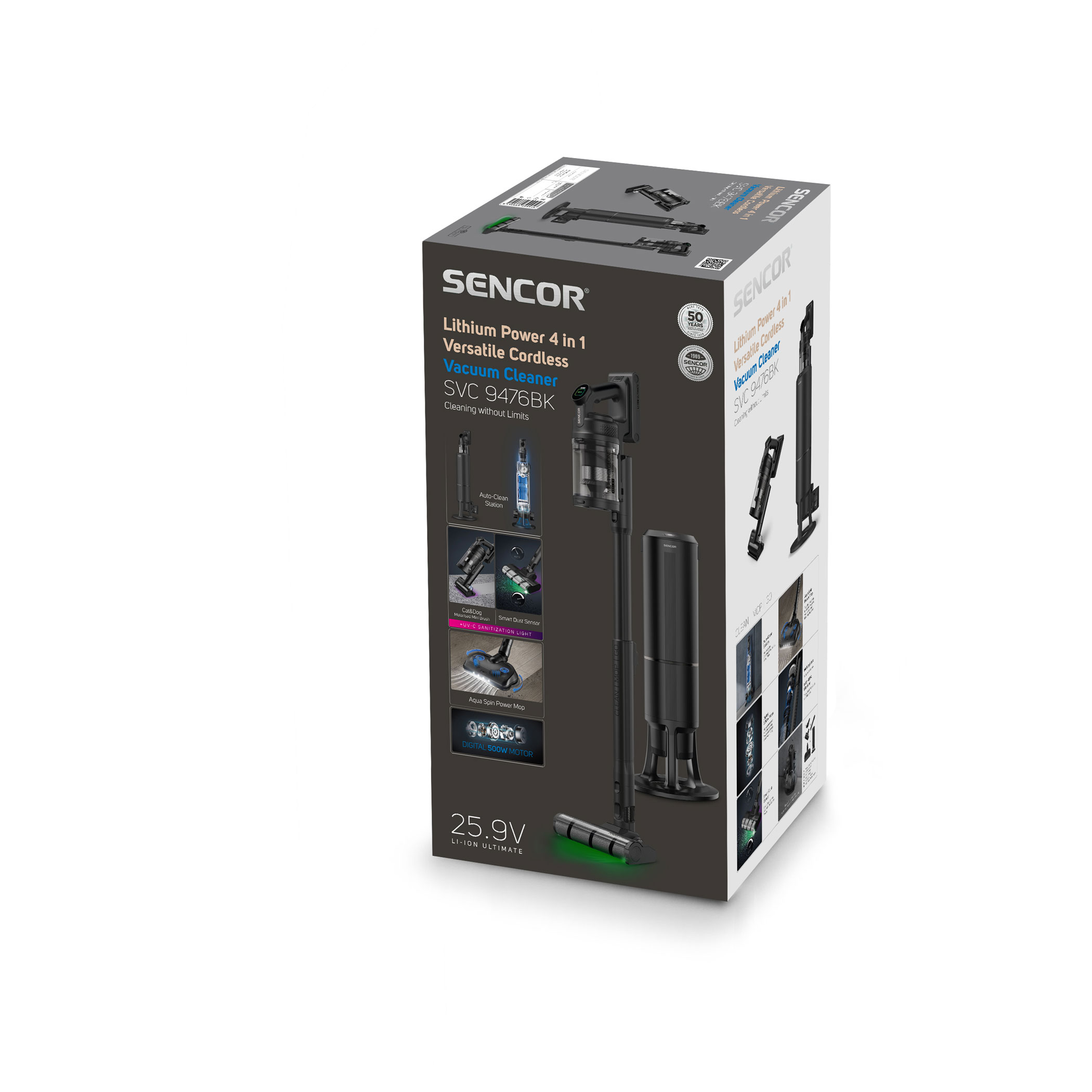 SVC 9476BK využívá 500W digitální motor a multicyklónovou filtraci s HEPA H13 pro vysoký a trvalý sací výkon. Smart Dust Sensor automaticky reguluje tah podle míry znečištění, čímž optimalizuje spotřebu a prodlužuje provoz. Maximální délka provozu v základním stupni – až 55 minut. Motorizovaná podlahová hubice s MicroDust Vision LED osvětlením a UV-C sterilizací zviditelňuje prach a dezinfikuje povrchy. Mopovací hubice Aqua Spin umožňuje vysávání a vytírání v jednom kroku, zatímco motorizovaný rotační kartáč Cat & Dog s UV-C technologií hloubkově čistí čalounění i matrace, ze kterých odstraňuje nejen chlupy a vlasy, ale i bakterie a roztoče.Klíčové vlastnosti:
