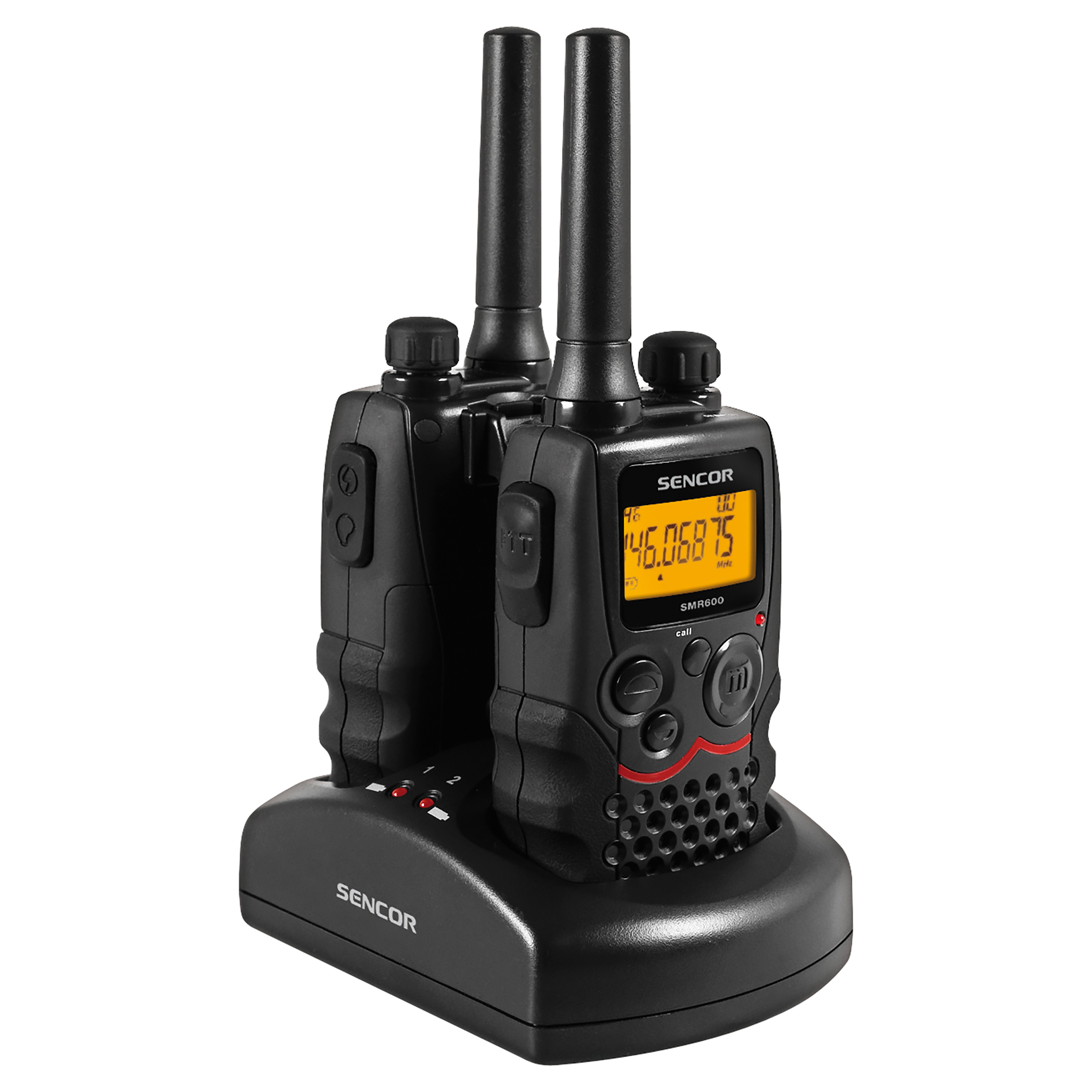Obsahuje: 2 radiostanice, 2 držáky na opasek, dobíjecí baterie, nabíjecí stojánek, síťový adaptér